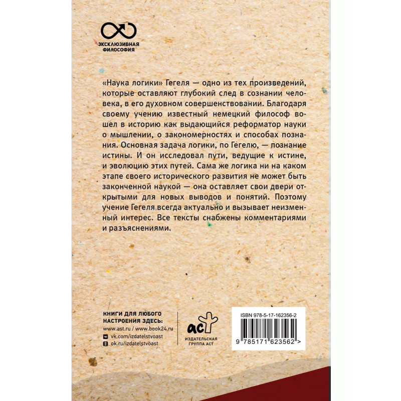 "Наука логики" Гегеля - одно из тех произведений, которые остав- ляют глубокий след в сознании человека, в его духовном совершен- ствовании. Благодаря своему учению известный немецкий философ вошел в историю как выдающийся реформатор науки о мышлении, о закономерностях и способах познания. Основная задача логики, по Гегелю, - познание истины. И он исследовал пути, ведущие к ис- тине, и эволюцию этих путей. Сама же логика ни на каком этапе свое- го исторического развития не может быть законченной наукой - она оставляет свои двери открытыми для новых выводов и понятий. Поэ- тому учение Гегеля всегда актуально и вызывает неизменный интерес. Все тексты снабжены комментариями и разъяснениями.