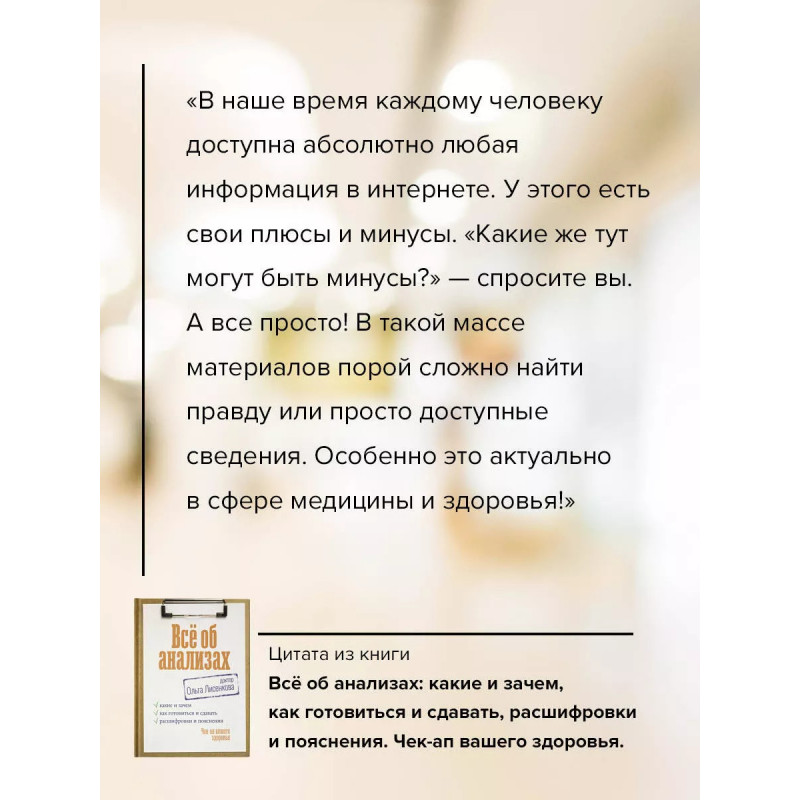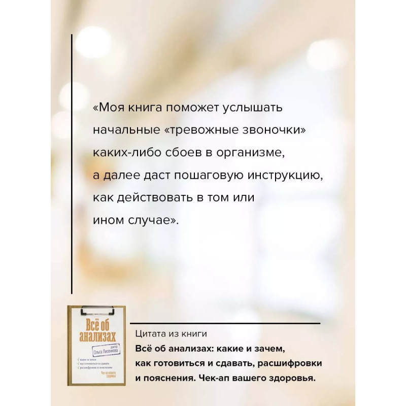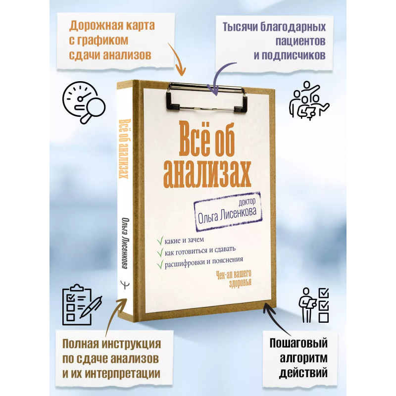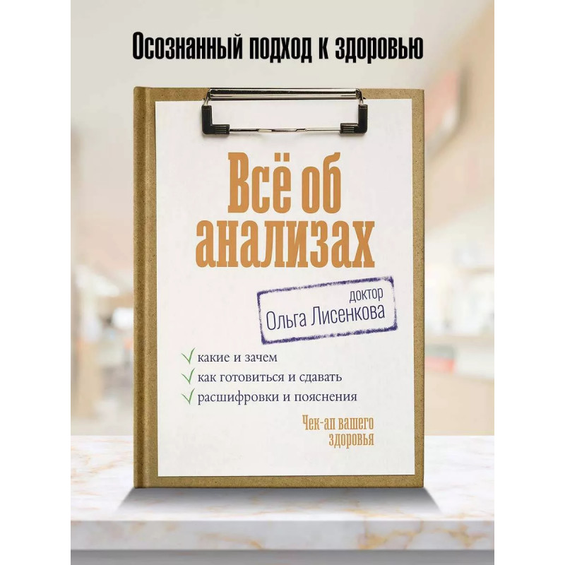 Научитесь читать... результаты анализов Хотите ли вы знать о своем здоровье больше? Если вам важно научиться самостоятельно расшифровывать то, что показывают ваши анализы, и более осознанно подходить к вашему здоровью, труд практикующего врача-невролога Ольги Лисенковой "Все об анализах. Чек-ап вашего здоровья" - то, что доктор прописал! На страницах издания вы найдете подробную информацию о том, как устроены и функционируют системы нашего организма и по каким симптомам можно понять, что они дали сбой. Вы узнаете, когда и какие именно анализы необходимо сдавать для своевременной профилактики заболеваний, и научитесь распознавать симптомы организма, на которые стоит обратить внимание. Вы научитесь читать и трактовать анализы, чтобы понимать, что происходит с вашим организмом, и отслеживать динамику состояния. Также в книге вы найдете шпаргалку о том, как готовиться к сдаче разных видов анализов, и авторские рекомендации по образу жизни и контролю веса, артериального давления, гормонов, витаминов и минералов. У