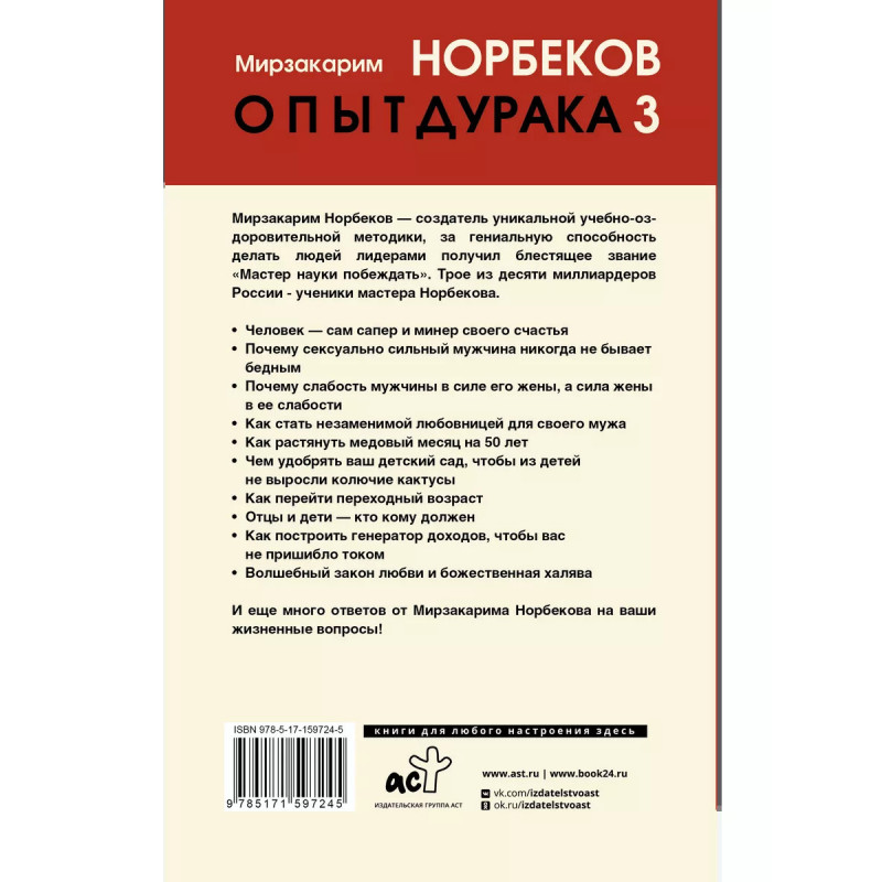 Опыт дурака 3. Самостоятельное изготовление семейного счастья в домашних условиях. Мирзакарим Норбеков - создатель уникальной учебно-оздоровительной методики, за гениальную способность делать людей лидерами получил блестящее звание "Мастер науки побеждать". Трое из десяти миллиардеров России - ученики мастера Норбекова. Человек - сам сапер и минер своего счастья. Если вам интересно, почему сексуально сильный мужчина никогда не бывает бедным, как преодолеть трудности переходного возраста, вырастить детей, а не колючих кактусов, и в это же время построить свой безотказный генератор доходов - погрузитесь в "Опыт дурака-3" Мирзакарима Норбекова, в волшебные законы любви и божественной халявы. Вы ведь хотите получить ответы на жизненные вопросы? Тогда вперед - читайте, осознавайте и действуйте!