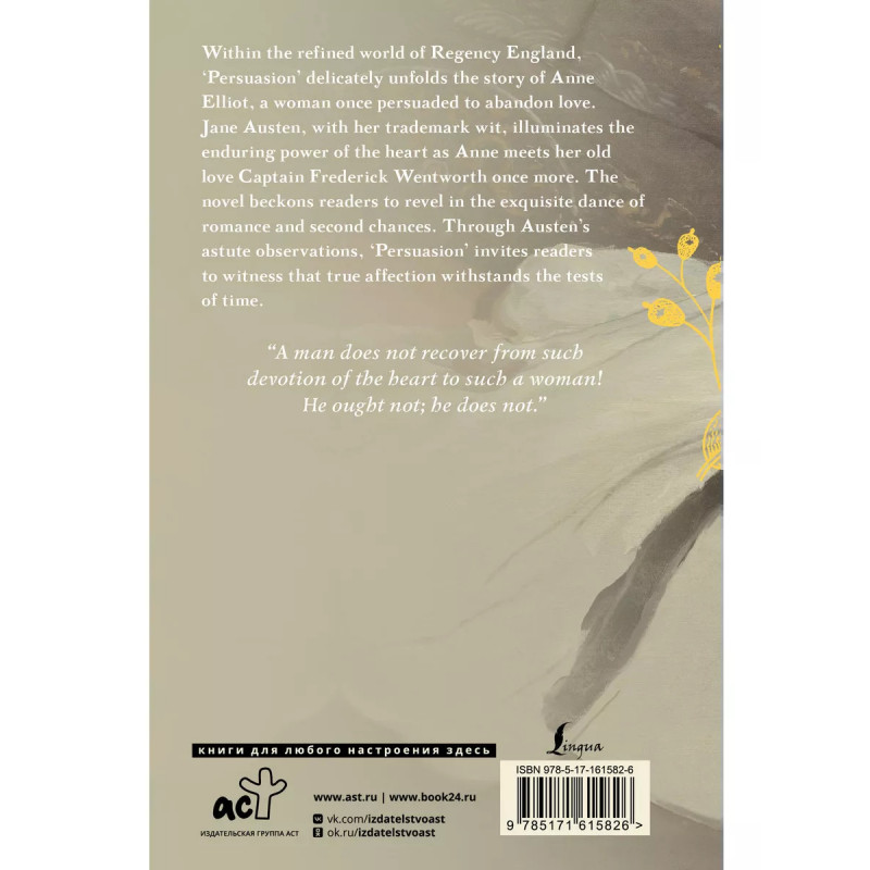КНИГА НА АНГЛИЙСКОМ ЯЗЫКЕ Предпочитаете учиться у носителей? Тогда у кого же, как не у Джейн Остен? Persuasion" или "Доводы рассудка" - это последний роман Остен, писательницы, с чьим именем неразрывно связана английская литература. Он рассказывает о судьбе Энн Элиотт, девушки, которая отказалась от помолвки, уступив доводам "мудрых" людей. Через несколько лет она вновь сталкивается с со своим прежним женихом. Прекрасный шанс для неё; но теплится ли ещё любовь в его сердце? Это самый зрелый роман Джейн Остен, достаточно небольшой, чтобы без труда прочесть его. Текст приведен без адаптации и сокращений. Наслаждайтесь изысканной иронией Джейн Остен в оригинале!