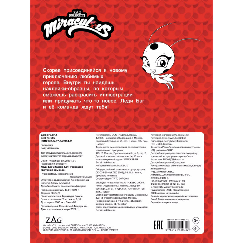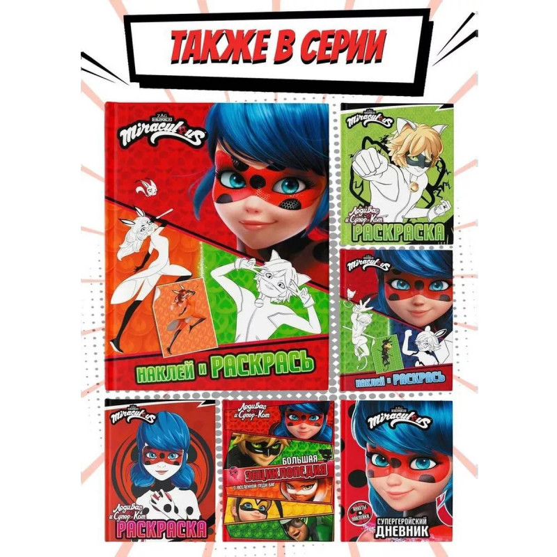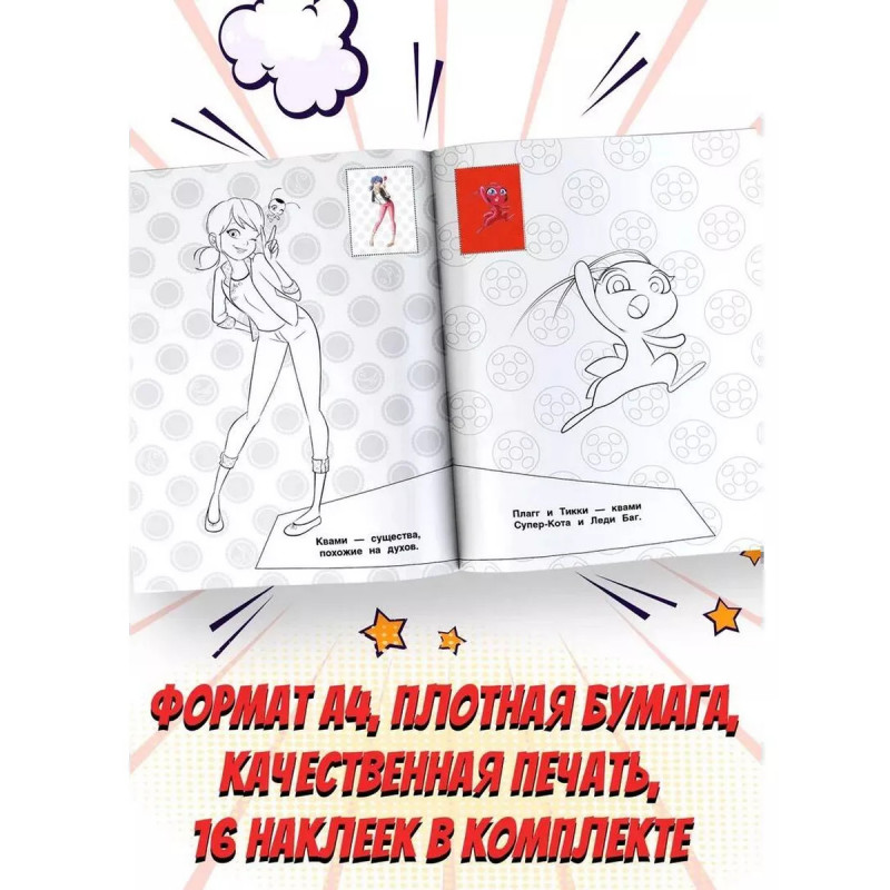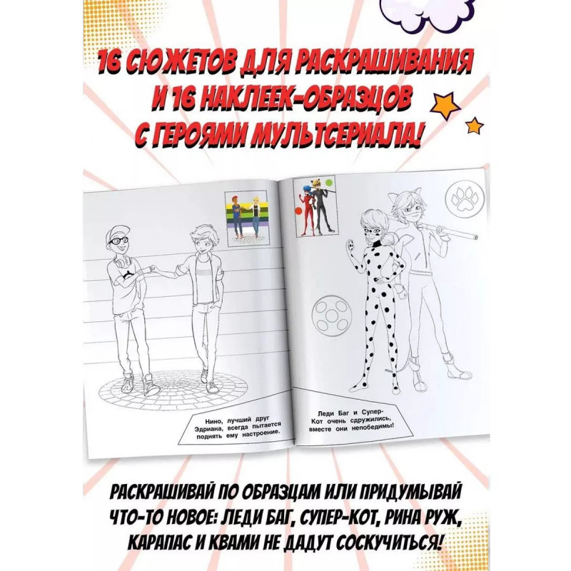 Скорее присоединяйся к новому приключению любимых героев. Внутри ты найдёшь наклейки-образцы, по которым сможешь раскрасить иллюстрации или придумать что-то новое. Леди Баг и её команда ждут тебя!