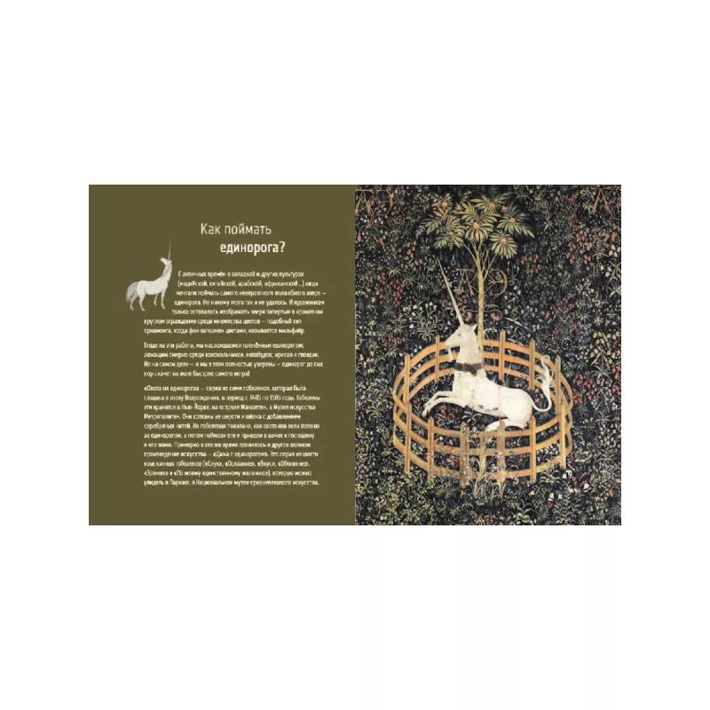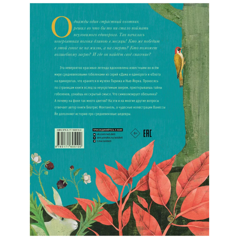 Однажды один страстный охотник решил во что бы то ни стало поймать неуловимого единорога. Так началась невероятная погоня длиною в месяцы! Кто же победит в этой гонке не на жизнь, а на смерть? Кто поможет волшебному зверю? И где он найдёт своё спасение? Эта невероятно красивая легенда вдохновлена известными во всём мире средневековыми гобеленами из серий "Дама и единорог" и "Охота на единорога", что хранятся в музеях Парижа и Нью-Йорка. Проносясь по страницам книги вслед за неукротимым зверем, приоткрываешь тайны гобеленов, узнаёшь их скрытый смысл. Что символизирует обезьянка? А почему на фоне так много цветов? На эти и на многие другие вопросы отвечает автор книги Беатрис Фонтанель, а чудесные иллюстрации Ванессы Йе дополняют историю про средневековые шедевры.
