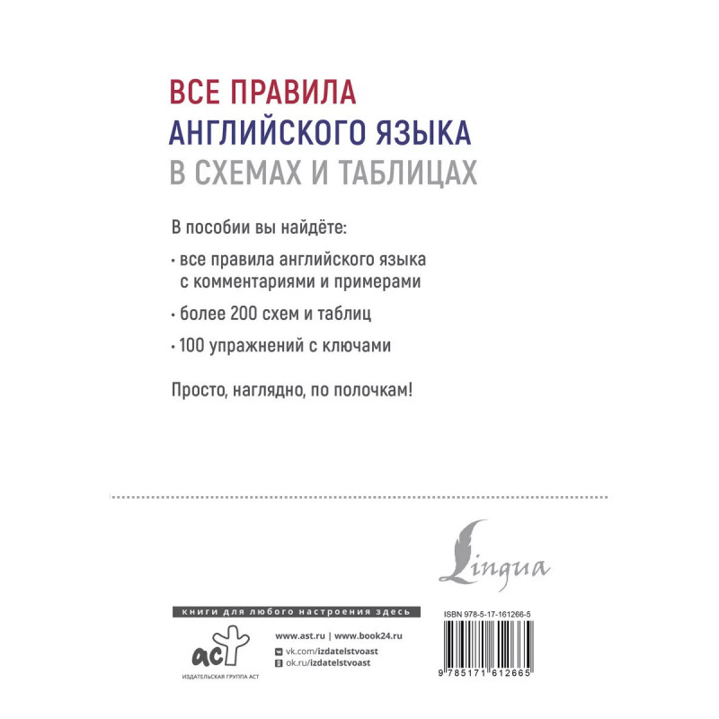 Все правила английского языка в схемах и таблицах. Державина Виктория Александровна - опытный педагог с многолетней практикой преподавания, автор множества пособий по английскому языку. Издание охватывает полный объем грамматики английского языка, необходимый для уровней A1-B1. В этом самоучителе подробно рассмотрены такие темы, как времена английских глаголов, модальные глаголы, употребление предлогов, артиклей и местоимений, а также построение вопросов и условных предложений. После каждой темы предлагаются упражнения для закрепления изученной теории. Проверить правильность выполнения заданий можно при помощи ключей, вы найдете их в конце книги. Главная особенность этого издания - четкие и наглядные схемы, которые помогут вам усвоить или повторить материал максимально эффективно. Пособие предназначено для широкого круга читателей, рекомендуется всем, кто учит или хочет выучить английский язык.
