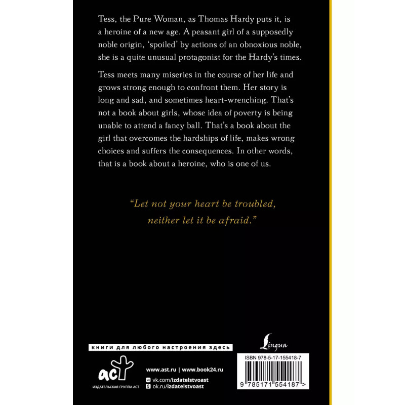 Tess ot the d'Urbervilles. Устали от драмы вокруг? Найдите убежище в классической английской драме! Томас Гарди - английский писатель-романист XIX-XX вв. Его романы "Тэсс из рода дЭрбервиллей", "Вдали от обезумевшей толпы", "Джуд Незаметный" и многие другие снискали давнее признание и обрели множество экранизаций. "Тэсс" рассказывает о трагической судьбе крестьянской девушки, принадлежавшей к древнему рыцарскому роду. Но вместе с благородным происхождением Тесс обрела и много бед. Книга издана в неадаптированной версии. Наслаждайтесь изысканным английским языком Томаса Гарди в оригинале!