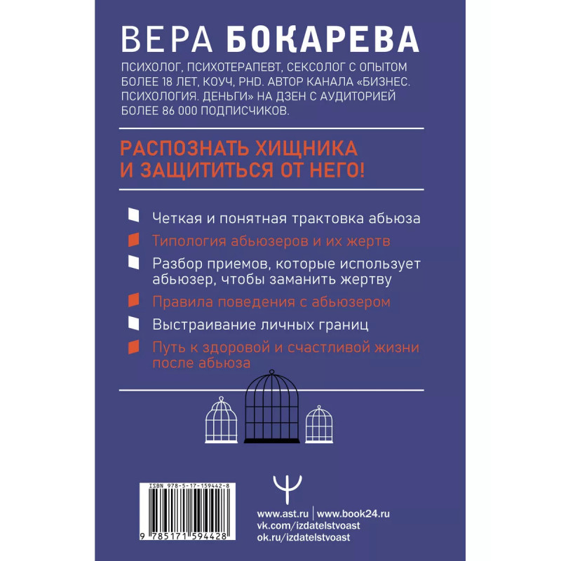Абьюз: маски, которые надевает хищник. Как вырваться из лап абьюзера и как в них никогда не попадать. Вера Бокарева - психолог, психотерапевт, сексолог с опытом более 18 лет, автор канала по психологии на Дзен с аудиторией более 86 подписчиков. Абьюз многолик: он притворяется заботой, вниманием и любовью. Но маски слетают, и бывает уже слишком поздно: вы в ловушке, из которой выбирается не каждый. Абьюз - это модель поведения, предполагающая насилие одного человека над другим. Абьюз лишает вас свободы и шансов на полноценную счастливую жизнь. Поэтому так важно вовремя распознать абьюзера и защититься от него. Как уйти от абьюзера? Что такое стратегия "серый камень" и как она помогает противостоять деструктивным личностям? Из каких трех шагов состоит восстановление после абьюза? Что включает в себя кодекс жизни без абьюза, и как он поможет не становиться удобной жертвой? В отношениях с людьми не нужно терпеть, страдать и мучиться! Вы заслуживаете любви, уважения и счастья. Заслуживаете жить, как хотите.