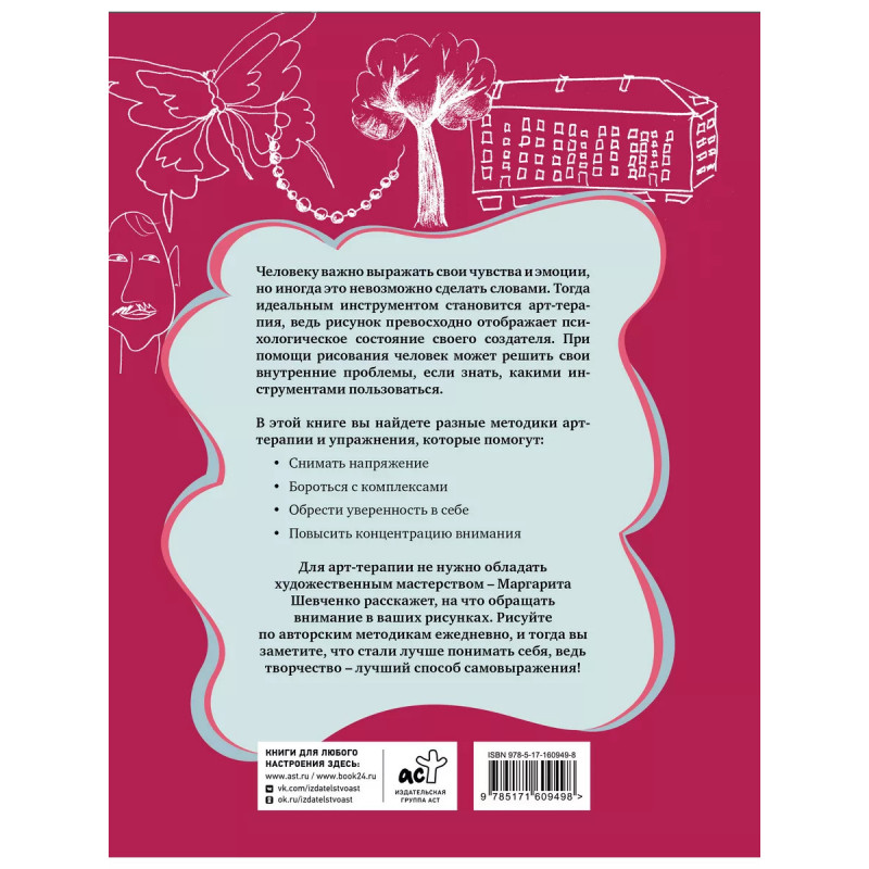 Человеку важно выражать свои чувства и эмоции, но иногда это невозможно сделать словами. Тогда идеальным инструментом становится арт-терапия, ведь рисунок превосходно отображает психологическое состояние своего создателя. При помощи рисования человек может решить свои внутренние проблемы, если знать, какими инструментами пользоваться. В этой книге вы найдете разные методики арт-терапии и упражнения, которые помогут: " снимать напряжение; " бороться с комплексами; " обрести уверенность в себе; " повысить концентрацию внимания. Для арт-терапии не нужно обладать художественным мастерством - Маргарита Шевченко расскажет, на что обращать внимание в ваших рисунках. Рисуйте по авторским методикам ежедневно, и тогда вы заметите, что стали лучше понимать себя, ведь творчество - лучший способ самовыражения!