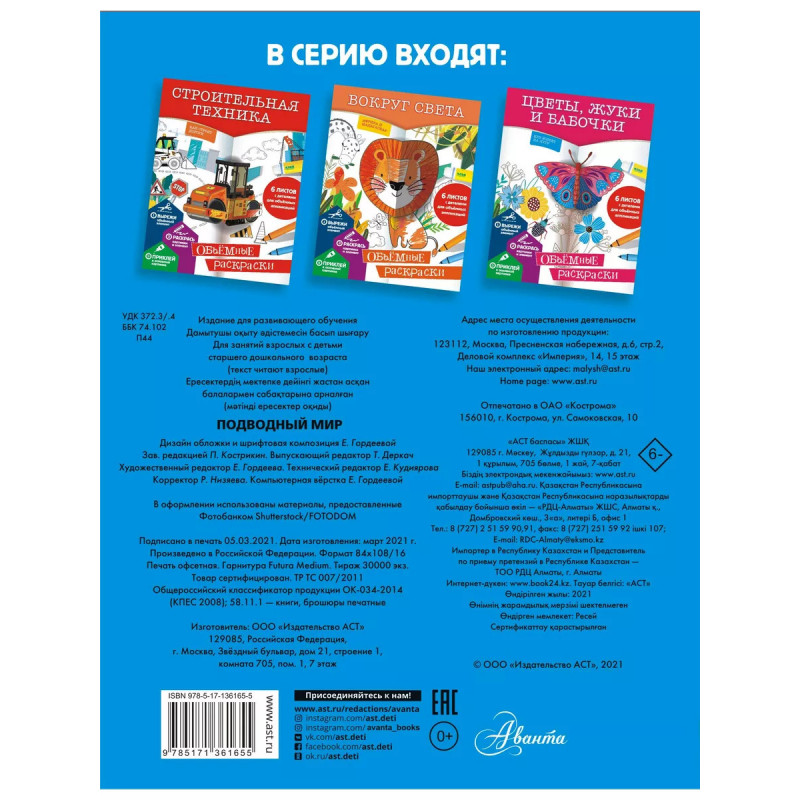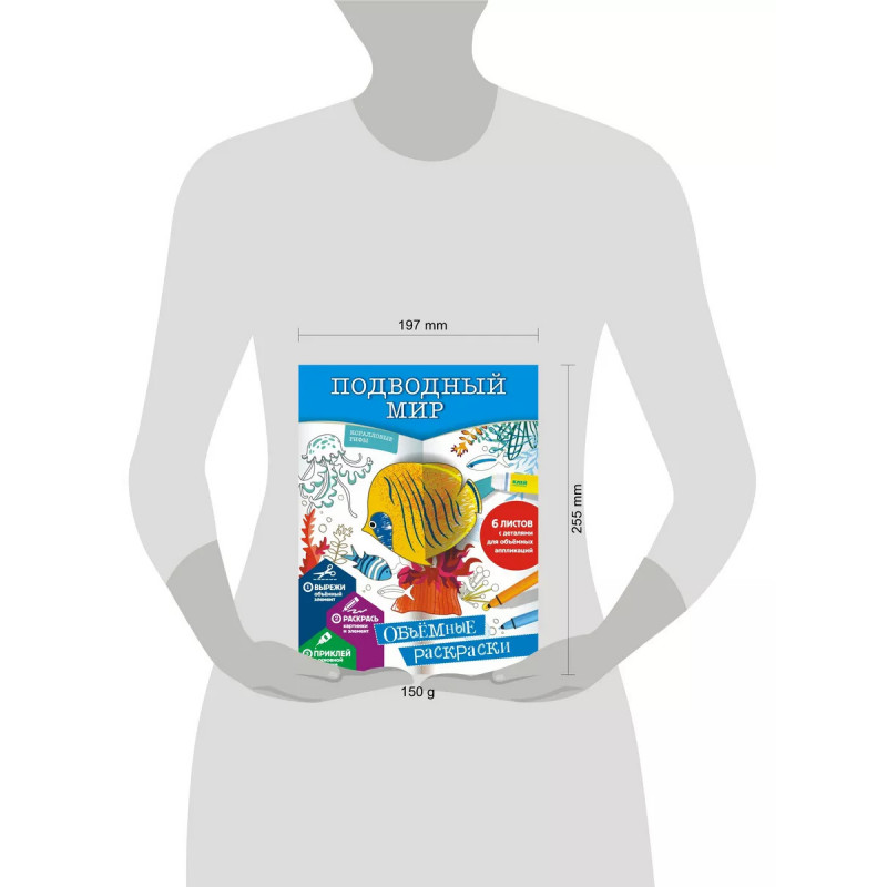 Подводный мир. Новая серия "Объемные раскраскиФП" Эти книги можно не только раскрашивать, но и создавать на их страницах настоящие объемные аппликации. Для этого надо вырезать детали с центральных страниц книги и наклеить их на развороты в нужных местах.