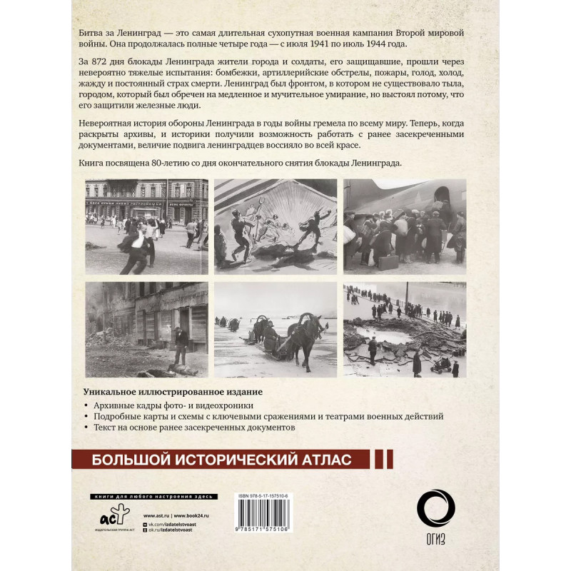 Блокада Ленинграда. Битва за Ленинград - это самая длительная сухопутная военная кампания Второй мировой войны. Она продолжалась полные четыре года - с июля 1941 по июль 1944 года. За 872 дня блокады Ленинграда жители города и солдаты, его защищавшие, прошли через невероятно тяжелые испытания: бомбежки, артиллерийские обстрелы, пожары, голод, холод, жажду и постоянный страх смерти. Ленинград был фронтом, в котором не существовало тыла, городом, который был обречен на медленное и мучительное умирание, но выстоял потому, что его защитили железные люди. Невероятная история обороны Ленинграда в годы войны гремела по всему миру. Теперь, когда раскрыты архивы и историки получили возможность работать с ранее засекреченными документами, величие подвига ленинградцев воссияло во всей красе. Книга посвящена 80-летию со дня окончательного снятия блокады Ленинграда.
