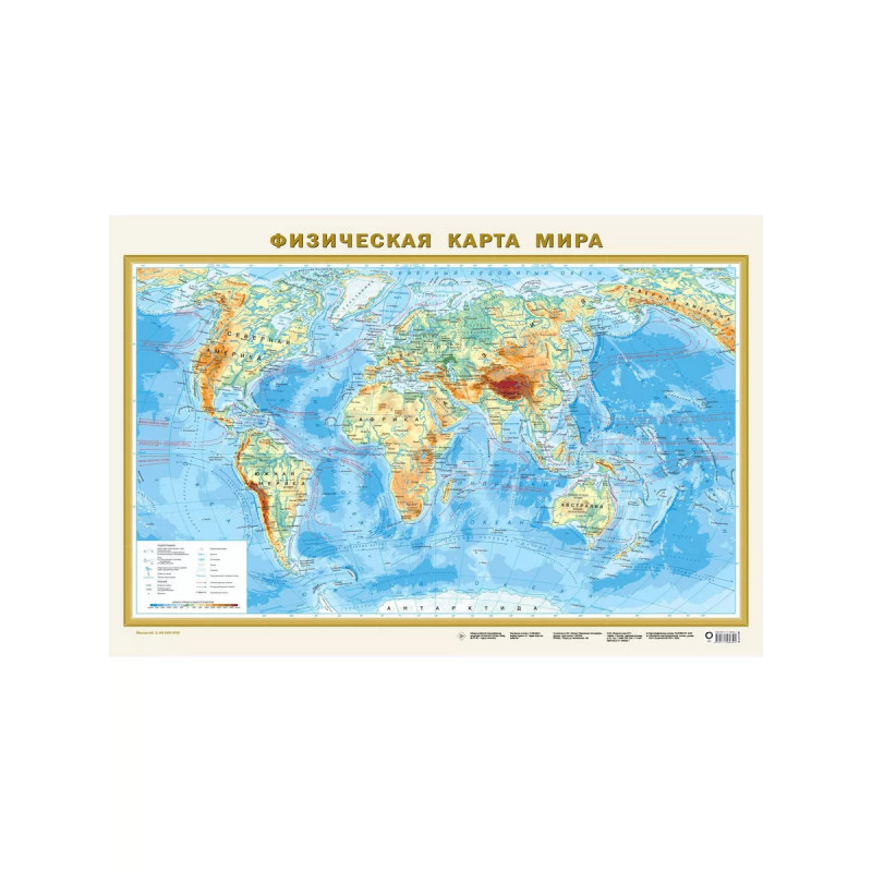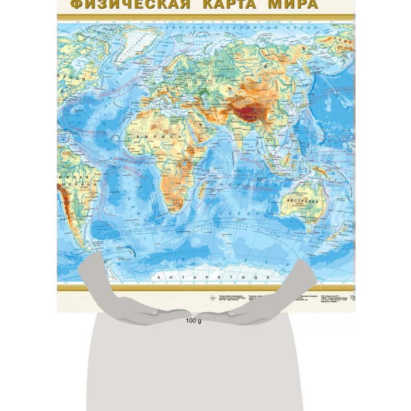 Физическая карта мира масштаба 1:4 (в 1 см 4 км) наглядно демонстрирует распределение горного, равнинного и промежуточных типов рельефа по поверхности суши Земли. Пунсонами с высотными отметками показаны высочайшие вершины всех континентов и основных горных систем. Объекты гидрологической сети на карте включают все наиболее крупные реки с притоками и озёра. Представлен также рельеф дна Мирового океана с выделением хребтов, котловин и глубоководных желобов с их наибольшими глубинами. В океанах показаны тёплые и холодные течения. Эта настенная карта, покрытая с лицевой стороны антибликовой полимерной плёнкой, имеет размеры 87х58 мм. Карта упакована в прозрачный тубус (пакет из мягкого пластика с объёмным дном и еврослотом). Размеры тубуса: длина 59 см, диаметр 5 см.