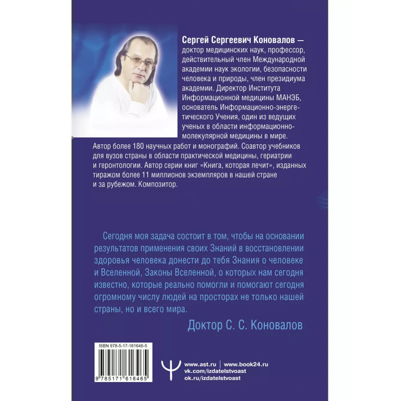Эта книга Сергея Сергеевича Коновалова, посвященная вопросам здоровья пищеварительной системы человека, необходима как тем, кто уже столкнулся с заболеваниями органов пищеварения, хочет вылечиться сам и помочь своим родным и близким быть здоровыми, так и тем, кто хочет предотвратить нарушения работы ЖКТ и научиться жить насыщенной, активной и интересной жизнью. Важная информация о причинах, симптомах и методах лечения заболеваний органов пищеварения, рекомендации по питанию. Энергетические упражнения для восстановления полноценной работы ЖКТ. Особенно нужна эта книга: " Тем, кто болен и кому медицина отказывает в помощи. Сергей Сергеевич Коновалов помог уже сотням тысяч неизлечимых больных. " Тем, кто не хочет болеть и стареть, хочет понять причины своих болезней и ищет способы исцеления души и тела. " Тем, кто интересуется Информационно-энергетическим Учением, ищет знания об устройстве человека, Мира и Вселенной, кого интересует личность Доктора и его жизненный путь. " Тем, у кого "болит душа", кто отчаялся,