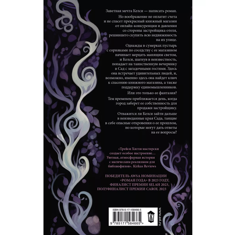 Сумеречный Сад. Заветная мечта Келси - написать роман. Но воображение не оплатит счета и не спасет прекрасный книжный магазин от онлайн-конкуренции и давления со стороны застройщика отеля, решившего скупить всю недвижимость на их улице. Однажды в сумерках пустырь с сорняками по соседству с ее магазином начинает мерцать манящим светом, и Келси, шагнув в неизвестность, попадает на таинственную вечеринку в Сад с загадочными гостями. Здесь она встречает удивительных людей, и, возможно, именно здесь она найдет ключ к спасению книжного магазина, а также поддержку единомышленников. Или это только ее фантазия? Тем временем приближается день, когда город заберет ее собственность для продажи застройщику. Отважится ли Келси зайти дальше в неизведанные края Сада, таящие в себе опасные откровения о ее прошлом, но которые могут дать ответы на ее вопросы?