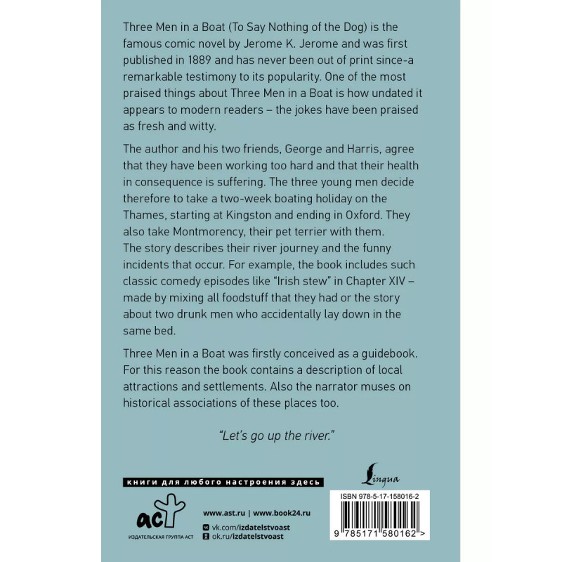 Three Men in a Boat (To say Nothing of the Dog). Трое в лодке, не считая собаки - это юмористическая повесть Джерома К. Джерома, не теряющая своей популярности с XIXвека. Трое друзей Джей, Джордж и Харрис, решив поправить свое здоровье, отправляются в путешествие вверх по Темзе от Кингстона до Оксфорда. С собой они берут пса по кличке Монморанси. В пути друзья попадают в разные курьезные ситуации, из которых выходят с присущим английским джентельменам достоинством. Изначально эта книга задумывалась как путеводитель, поэтому она содержит описание достопримечательностей и населенных пунктов, а также занимательные факты об истории и географии этих мест. Наслаждайтесь любимым произведением на языке оригинала!