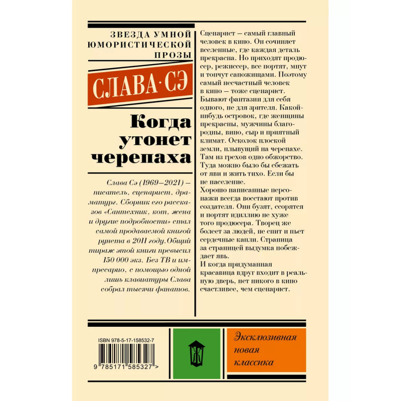 Когда утонет черепаха. - Юмористический бестселлер в удобном покет-формате. - Слава Сэ - писатель, сценарист, драматург, прославился своими юмористическими зарисовками в Сети в 21-х, выпустил множество сборников и влюбил в себя тысячи фанатов. - Каждая его книга полна феерических персонажей и комичных ситуаций, а все конфузы и приключения написаны с лёгкостью и мастерством. - Ироничный, тонкий, поэтичный роман-притча, который виртуозно обманывает ожидания читателей снова и снова. - Великолепные диалоги в книге можно целиком растаскивать на цитаты. А серьезные, философские темы, поданные с тонким юмором, рассмешат и заставят задуматься.