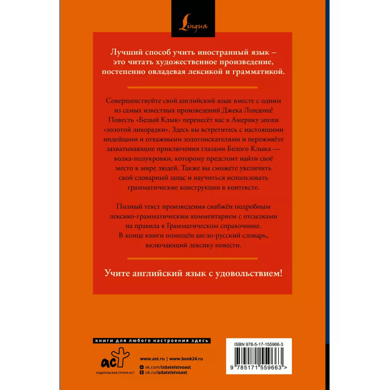 Белый Клык White Fang: читаем в оригинале с комментарием. Лучший способ учить иностранный язык - это читать художественное произведение, постепенно овладевая лексикой и грамматикой. Совершенствуйте свой английский язык вместе с одним из самых известных произведений Джека Лондона! Повесть "Белый Клык" перенесёт вас в Америку эпохи "золотой лихорадки". Здесь вы встретитесь с настоящими индейцами и отважными золотоискателями и переживёте захватывающие приключения глазами Белого Клыка - волка-полукровки, которому предстоит найти своё место в мире людей. Также вы сможете увеличить свой словарный запас и научиться использовать грамматические конструкции в контексте. Полный текст произведения снабжён подробным лексико-грамматическим комментарием с отсылками на правила в Грамматическом справочнике. В конце книги помещен англо-русский словарик, содержащий лексику романа. Издание предназначено для всех, кто учит английский язык и стремится читать книги в оригинале.