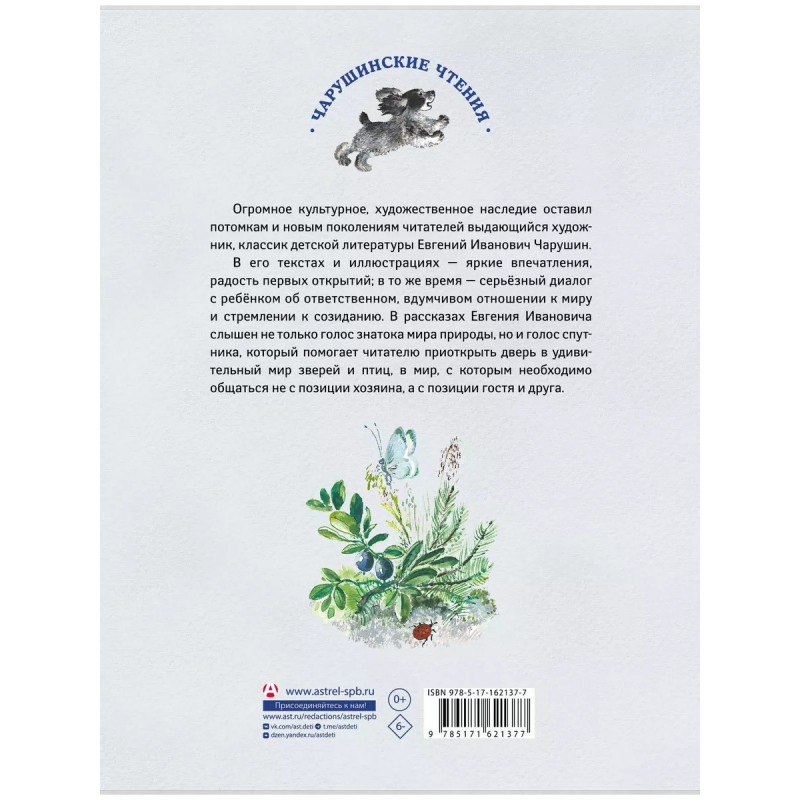 Серия Чарушинские чтения знакомит читателей с произведениями династии художников и писателей Чарушиных. Евгений Иванович Чарушин всемирно известный художник и писатель. Его рассказы знакомы многим поколениям читателей и входят в школьную программу по литературе, а иллюстрации пронизаны любовью и уважением к природе.
