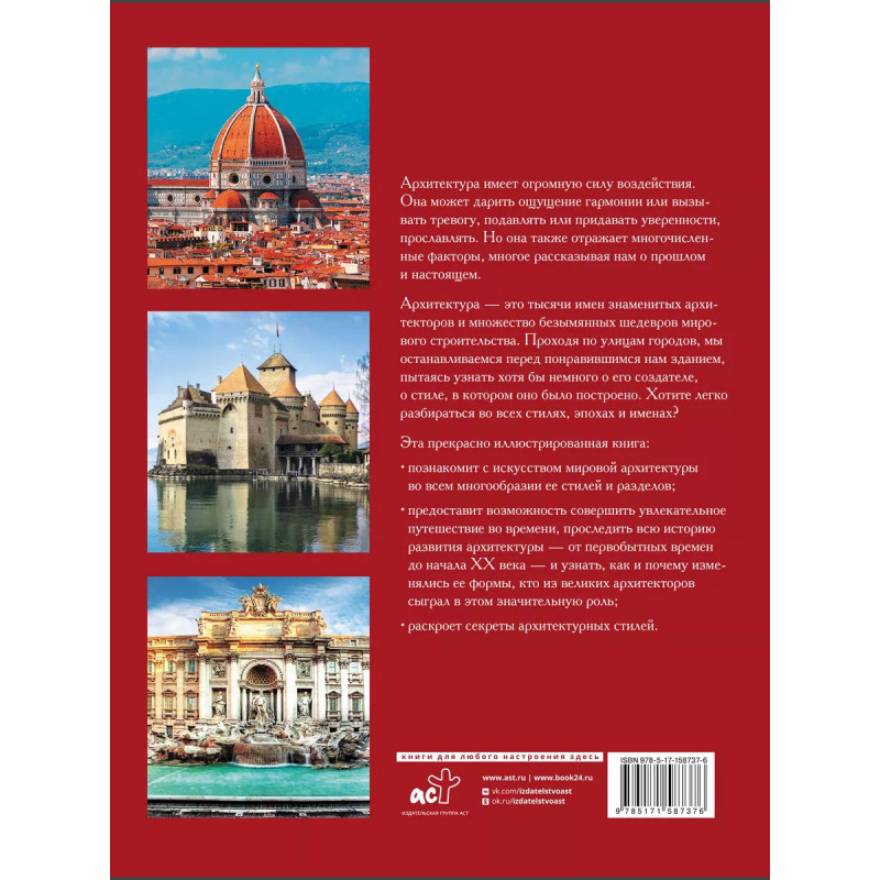 Шедевры архитектуры. Архитектура имеет огромную силу воздействия. Она может дарить ощущение гармонии или вызывать тревогу, подавлять или придавать уверенности, прославлять. Но она также отражает многочисленные факторы, многое рассказывая нам о прошлом и настоящем. Это прекрасно иллюстрированное издание познакомит с искусством архитектуры во всем многообразии ее основных стилей, областей и разделов. Оно будет особенно интересно тем, кто хотел бы проследить всю историю развития архитектуры - от первобытных времен до начала XX, - понять, как и почему изменились ее формы, кто из великих архитекторов сыграл в этом значительную роль. В книге также раскрываются секреты возведения самых знаменитых архитектурных сооружений, что дает возможность по-новому взглянуть на известные всему миру шедевры.