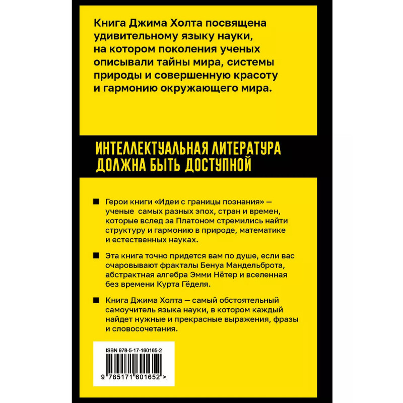 Идеи с границы познания. Эйнштейн, Гёдель и философия науки. Книга Джима Холта посвящена удивительному языку науки, на котором поколения ученых описывали тайны мира, системы природы и совершенную красоту и гармонию окружающего мира. Герои книги "Идеи с границы познания" - ученые самых разных эпох, стран и времен, которые вслед за Платоном стремились найти структуру и гармонию в природе, математике и естественных науках. Эта книга точно придется вам по душе, если вас очаровывают фракталы Бенуа Мандельброта, абстрактная алгебра Эмми Нётер и вселенная без времени Курта Гёделя. Книга Джима Холта - самый обстоятельный самоучитель языка науки, в котором каждый найдет нужные и прекрасные выражения, фразы и словосочетания.