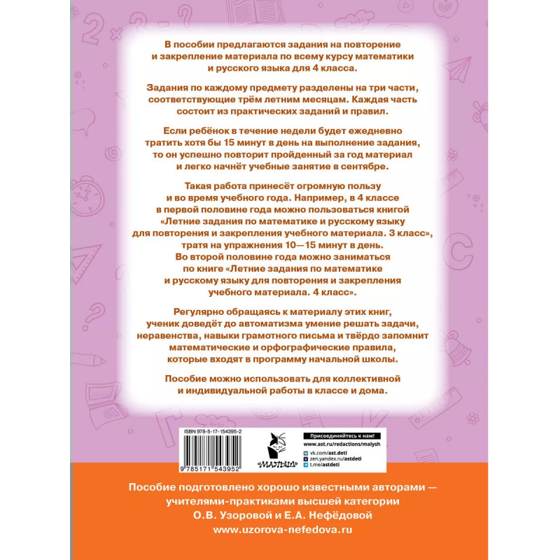 В пособии предлагаются задания на повторение и закрепление материала по всему курсу математики и русского языка для 4 класса. Занимаясь всего 15 минут в день, ребёнок успешно повторит пройденный за год материал и легко начнёт учебные занятие в сентябре. Регулярно обращаясь к этой книге, ученик доведёт до автоматизма умение решать задачи, неравенства, навыки грамотного письма и твёрдо запомнит математические и орфографические правила, которые входят в программу начальной школы. Пособие можно использовать для коллективной и индивидуальной работы в классе и дома. О. В. Узорова и Е.А Нефёдова известные педагоги-практики, авторы самых издаваемых учебников и учебных пособий в России. Основанные на авторской методике, доказавшей свою эффективность миллионными тиражами, эти пособия помогут родителям подготовить ребенка к школе, а ученикам легко и эффективно освоить программу начальной школы. Все, что поможет ребенку стать успешным в учёбе, вы найдёте в книгах Узоровой и Нефёдовой.