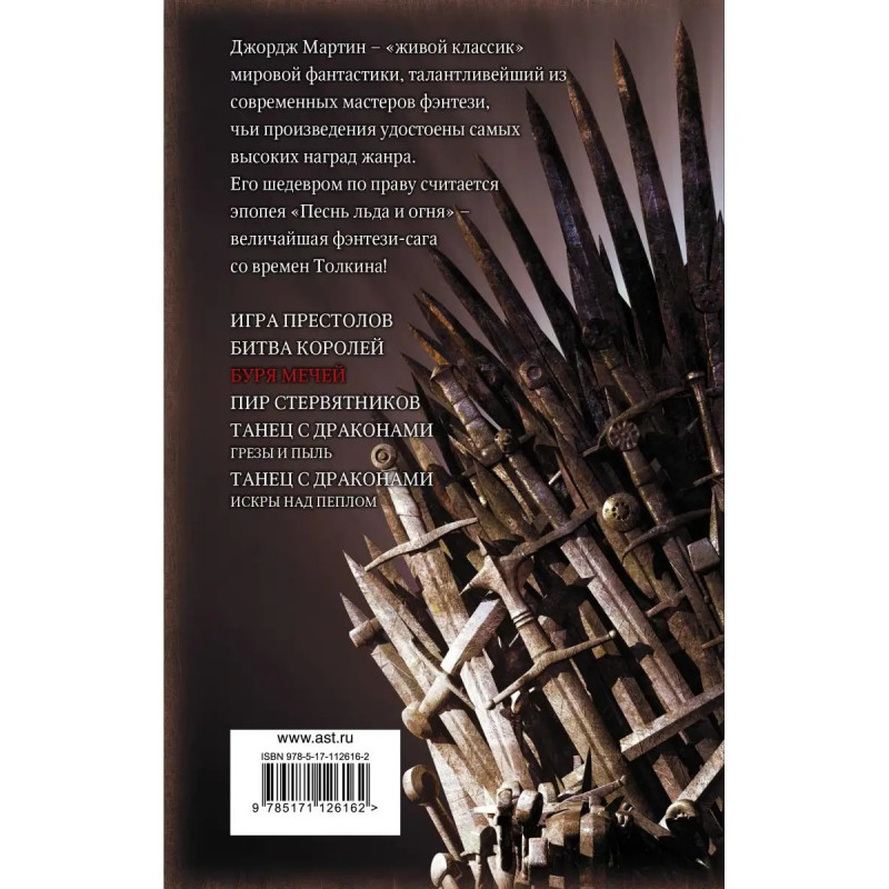 Перед вами - третья летопись цикла "Песнь льда и огня". Эпическая, чеканная сага о мире Семи Королевств. О мире суровых земель вечного холода и радостных земель вечного лета. Мире лордов и героев, воинов и магов, чернокнижников и убийц - всех, кого свела воедино Судьба во исполнение древнего пророчества. О мире опасных приключений, великих деяний и тончайших политических интриг. Сотрясается в борьбе Железный Трон Семи Королевств. Предают друг друга недавние союзники, злейшими врагами становятся добрые друзья. В неприступном замке плетет сети изощренного заговора могущественная чернокнижница... В далеких, холодных землях собирает силы юный властитель Севера Робб от Дома Старк... Новые и новые воины сходятся под знаменами Даэнерис Бурерож-денной, правящей последними из оставшихся в мире драконов... Но ныне в разгорающийся пожар сражений вступают еще и Иные - армия живых мертвецов, коих не остановить ни властью оружия, ни властью магии. БУРЯ МЕЧЕЙ грядет в Семи Королевствах - и многие падут в этой буре...