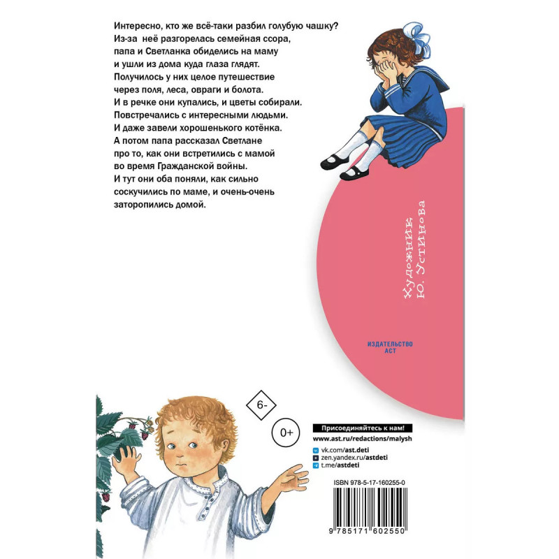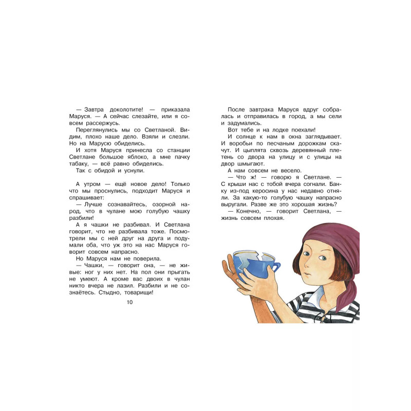 Голубая чашка. Интересно, кто же всё-таки разбил голубую чашку? Из-за неё разгорелась семейная ссора, папа и Светланка обиделись на маму и ушли из дома куда глаза глядят. Получилось у них целое путешествие через поля, леса, овраги и болота. И в речке они купались, и цветы собирали. Повстречались с интересными людьми. И даже завели хорошенького котёнка. А потом папа рассказал Светлане про то, как они встретились с мамой во время Гражданской войны. И тут они оба поняли, как сильно соскучились по маме, и очень-очень заторопились домой.