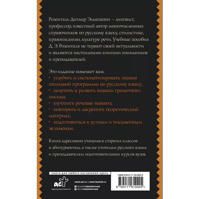 Розенталь Дитмар Эльяшевич лингвист, профессор, известный автор многочисленных справочников по русскому языку, стилистике, правописанию, культуре речи. Учебные пособия и справочники Д. Э. Розенталя не теряют своей актуальности и являются настольными книгами школьников и преподавателей. Издание содержит теоретические сведения по орфографии и морфологии, синтаксису и пунктуации, а также более 200 тренировочных упражнений. Благодаря работе с этим пособием учащиеся смогут не только повторить школьную программу, но и подготовиться к выпускным и вступительным экзаменам по русскому языку, особенно к ОГЭ и ЕГЭ. Книга адресована учащимся старших классов и абитуриентам, а также учителям русского языка и преподавателям подготовительных курсов вузов.