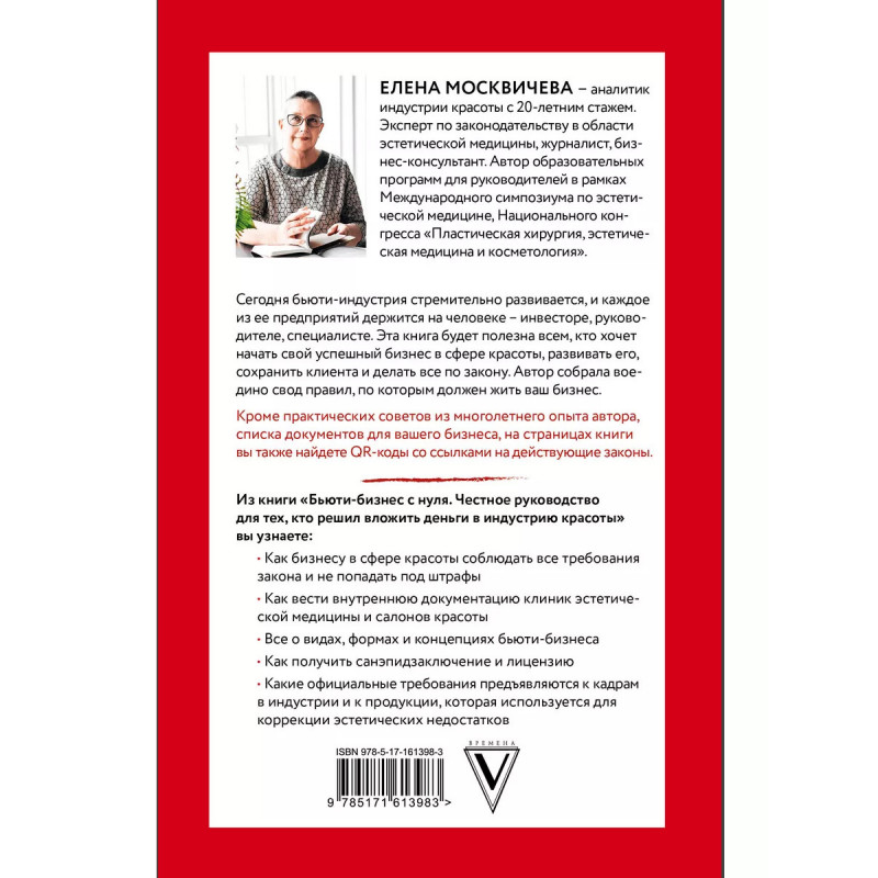 Бьюти-бизнес с нуля. Честное руководство для тех, кто решил вложить деньги в индустрию красоты. Елена Москвичева - аналитик индустрии красоты с 20-летним стажем. Эксперт по законодательству в области эстетической медицины, журналист, бизнес-консультант. Автор образовательных программ для руководителей в рамках Международного симпозиума по эстетической медицине, Национального конгресса "Пластическая хирургия, эстетическая медицина и косметология". Сегодня бьюти-индустрия стремительно развивается, и каждое из ее предприятий держится на человеке - инвесторе, руководителе, специалисте. Эта книга будет полезна всем, кто хочет начать свой успешный бизнес в сфере красоты, развивать его, сохранить клиента и делать все по закону. Автор собрала воедино свод правил, по которым должен жить ваш бизнес. Кроме практических советов из многолетнего опыта автора, списка документов для вашего бизнеса, на страницах книги вы также найдете QR-коды со ссылками на действующие законы. Из книги "Бьюти-бизнес с нуля. Честное руководство для тех, кто решил вложить деньги в индустрию красоты" вы узнаете: - как бизнесу в сфере красо