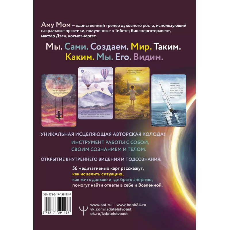 Исцеляющие карты. Вибрации, запускающие целительные процессы во всех сферах жизни. Аму Мом - единственный тренер духовного роста, использующий сакральные практики, полученные в Тибете; биоэнерготерапевт, мастер Дзен, космоэнергет. Мы. Сами. Создаем. Мир. Таким. Каким. Мы. Его. Видим. Эта уникальная исцеляющая авторская колода откроет внутреннее видение и сокрытое в человеческом Подсознании; расскажет, как исцелить ситуацию, как жить дальше и где брать энергию, поможет найти ответы в себе и Вселенной. Исцеляющие карты - это инструмент работы с Собой, своим сознанием и телом. Они оказывают энергокоррекционное воздействие на тело человека, на его энергетические центры, активирующие интуицию и эталонное состояние сознания. От просмотра и изучения иллюстраций карт ум расслабляется, и человек достигает медитативного состояния, за которым приходит исцеление. С первого же вопроса карты начинают "отвечать". Карты помогут найти и понять, где, в каком энергетическом центре у вас блок; какой энергетический центр хранит в себе "болезнь", вызывающую проблему за проблемой. Карты укажут на корень проблемы