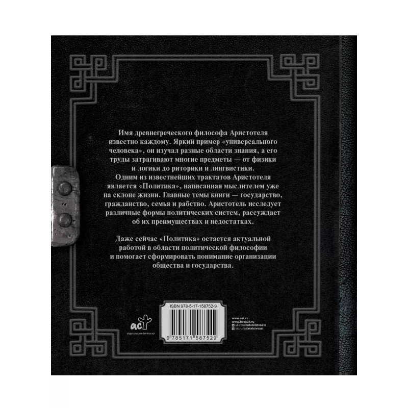 Аристотель. Политика. Имя древнегреческого философа Аристотеля известно каждому. Яркий пример "универсального человека", он изучал разные области знания, а его труды затрагивают многие предметы - от физики и логики до риторики и лингвистики. Одним из известнейших трактатов Аристотеля является "Политика", написанная мыслителем уже на склоне жизни. Главные темы книги - государство, гражданство, семья и рабство. Аристотель исследует различные формы политических систем, рассуждает об их преимуществах и недостатках.