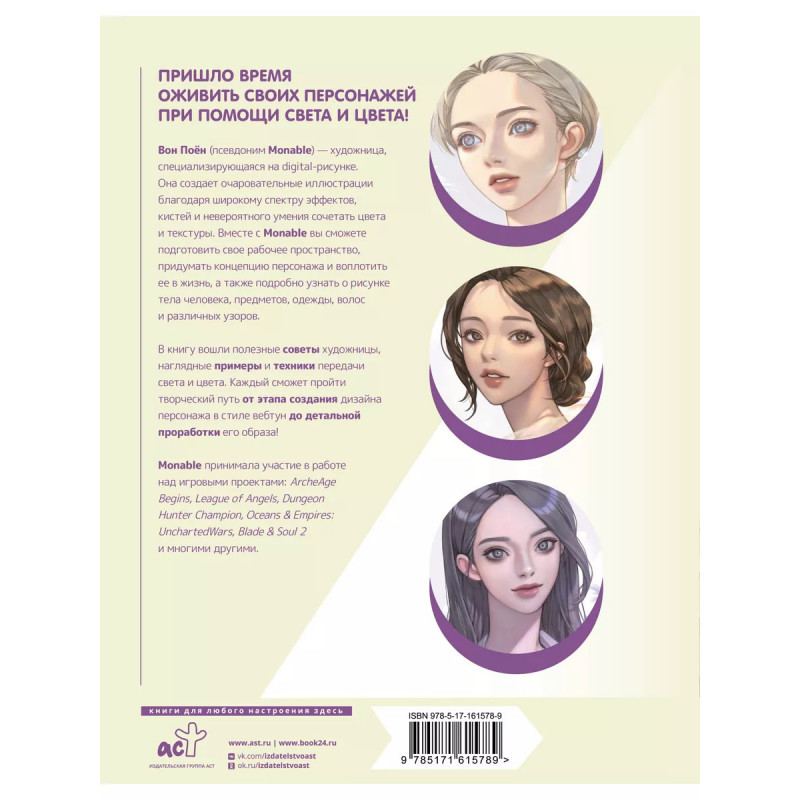 Рисуем в стиле вебтун с Monable. Свет и цвет. Хотите рисовать, как в Genshin Impact или ArchAge? Корейская художница Monable (Вон Поён) открывает секреты профессионального мастерства! В копилке автора - проекты ArcheAge Begins, League of Angels, Dungeon Hunter Champion, Oceans Empires: UnchartedWars, Blade Soul и многие другие. В своей книге Monable в деталях рассказывает, как содавать персонажей и разные фэнтезийные элементы в стиле вебтун, аниме, манги и видеоигр!