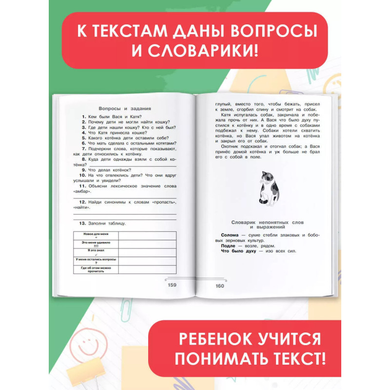 Занимаясь по этой книге, ребёнок будет глубже понимать текст, научится определять тему и главную мысль произведения, рассуждать о прочитанном и формулировать собственное мнение. Хрестоматия + практикум. Использованы тексты произведений, рекомендованных для изучения во 2 классе. Методическое сопровождение по эффективной методике Ольги Узоровой подробное объяснение, как работать с текстами. К текстам произведений даны вопросы и словарики непонятных слов и выражений. В конце книги - ответы на вопросы, которые могут вызвать затруднения.