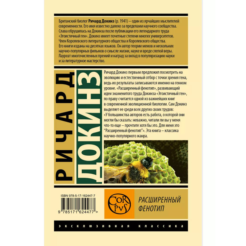 Расширенный фенотип. Ричард Докинз - крупный британский биолог, автор теории мемов. Его блестящие книги сыграли огромную роль в возрождении интереса к научно-популярной литературе. Ясность изложения, юмор и железная логика делают даже строго научные труды Докинза доступными широкому кругу читателей. Расширенный фенотип развивает идеи его знаменитой книги Эгоистичный ген (1976), где эволюция и естественный отбор рассматриваются с точки зрения гена. Эти идеи, вызвавшие бурную полемику, уже прочно вошли в научный обиход, а Расширенный фенотип по праву считается одной из важнейших книг в современной эволюционной биологии.