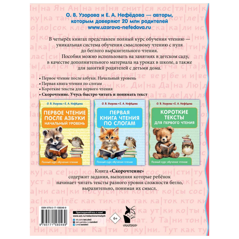 Пособие Скорочтение. Учусь быстро читать и понимать текст - четвёртая книга полного курса обучения чтению - уникальной системы обучения смысловому чтению с нуля до беглого выразительного чтения. Книга содержит задания, выполняя которые ребёнок начинает читать тексты разного уровня сложности бегло, выразительно, понимая их смысл. Первое чтение после азбуки. Начальный уровень Первая книга чтения по слогам Короткие тексты для первого чтения Скорочтение. Учусь быстро читать и понимать текст Все, что поможет ребенку подготовиться к школе, стать успешным в учёбе, вы найдёте в книгах известных авторов О.В. Узоровой и Е.А. Нефёдовой: обучение чтению, читаем по слогам, развивающее чтение, развивающее обучение, подготовка к школе, раннее развитие, дошкольное обучение.
