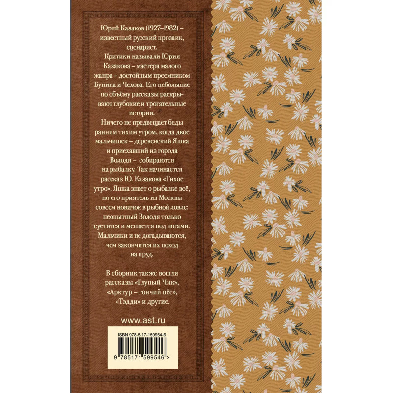 Тихое утро. Рассказы. Юрий Казаков (1927-1982) - известный русский прозаик, сценарист. Критики называли Юрия Казакова - мастера малого жанра - достойным преемником Бунина и Чехова. Его небольшие по объёму рассказы раскрывают глубокие и трогательные истории.Ничего не предвещает беды ранним тихим утром, когда двое мальчишек - деревенский Яшка и приехавший из города Володя - собираются на рыбалку. Так начинается рассказ Ю. Казакова "Тихое утро". Яшка знает о рыбалке всё, но его приятель из Москвы совсем новичок в рыбной ловле: неопытный Володя только суетится и мешается под ногами. Мальчики и не догадываются, чем закончится их поход на пруд.В сборник также вошли рассказы "Глупый Чик", "Арктур - гончий пёс", "Тэдди" и другие.