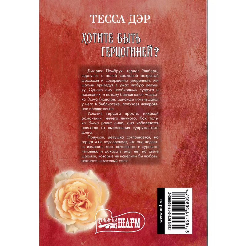 Хотите быть герцогиней?. Джордж Пембрук, герцог Эшбери, вернулся с полей сражений покрытый шрамами и совершенно уверенный: эти шрамы приведут в ужас любую девушку. Однако ему необходимы супруга и наследник, - и потому бедная юная модистка Эмма Гладстон, однажды появившаяся у него в библиотеке, получает невероятное предложение Условия герцога просты: никакой романтики, ничего личного. Как только Эмма родит сына, она избавляется навсегда от выполнения супружеского долга. Подумав, девушка соглашается, но герцог и не подозревает: она надеется изменить этого печального и сурового человека и доказать ему, - нет на свете шрамов, которых не исцелили бы любовь, нежность и веселый смех.