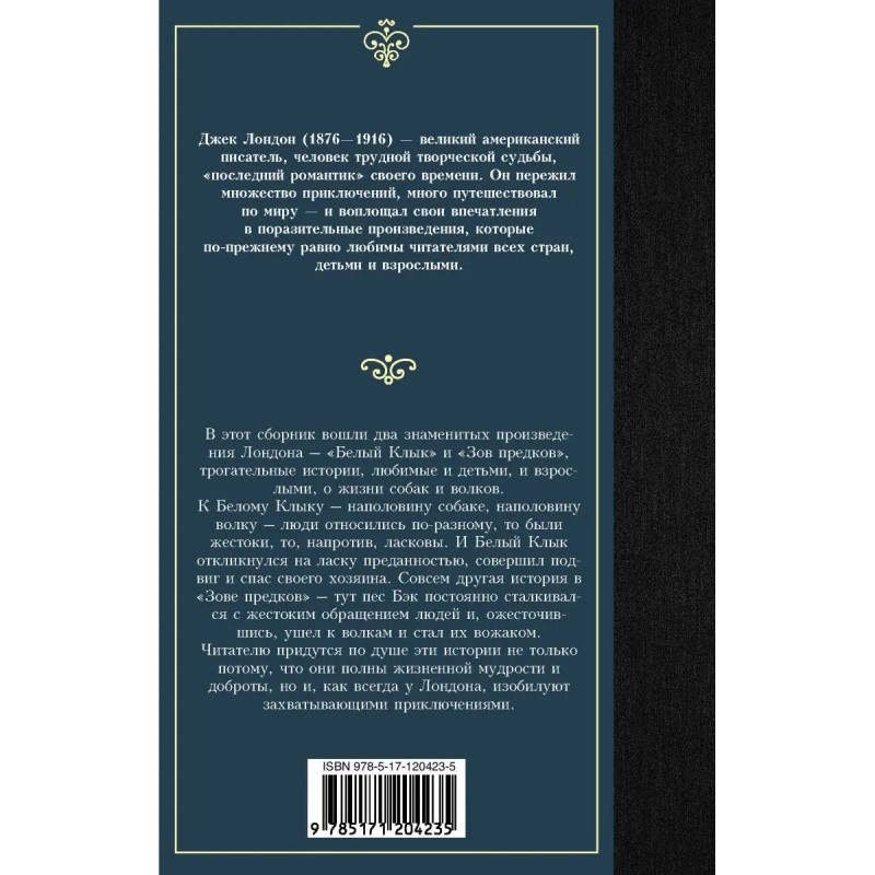 В сборник вошли два знаменитых произведения Лондона "Белый Клык" и "Зов предков", трогательные истории, любимые и детьми, и взрослыми, о жизни собак и волков. К Белому Клыку наполовину собаке, наполовину волку люди относились по-разному, то были жестоки, то, напротив, ласковы. И Белый Клык откликнулся на ласку преданностью, совершил подвиг и спас своего хозяина. Совсем другая история в "Зове предков" тут пес Бэк постоянно сталкивался с жестоким обращением людей и, ожесточившись, ушел к волкам и стал их вожаком. Читателю придутся по душе эти истории не только потому, что они полны жизненной мудрости и доброты, но и, как всегда у Лондона, изобилуют захватывающими приключениями.
