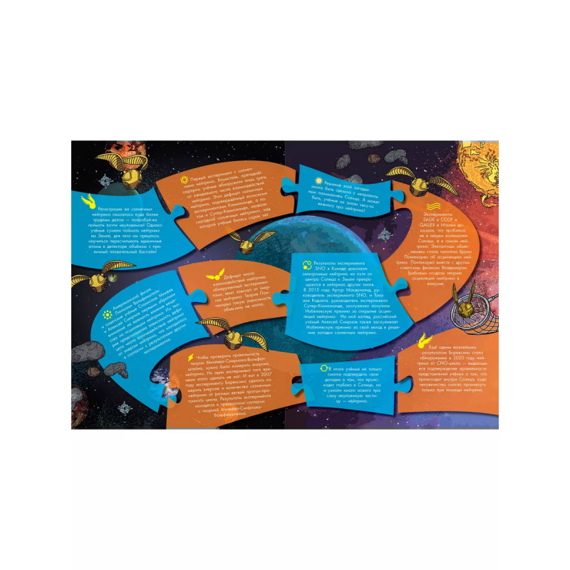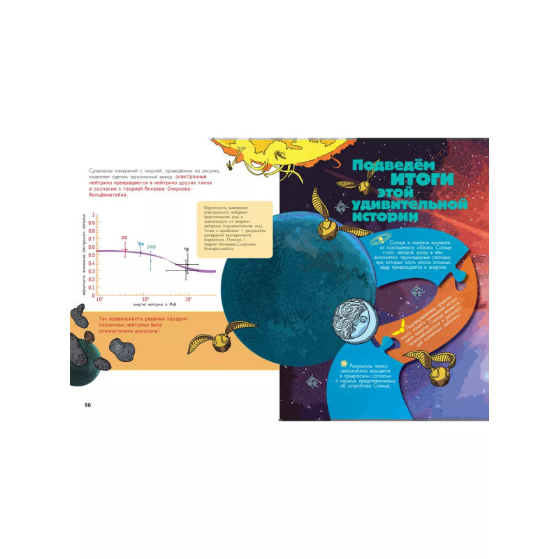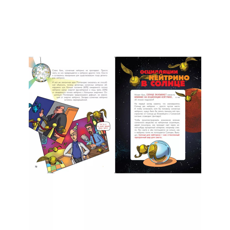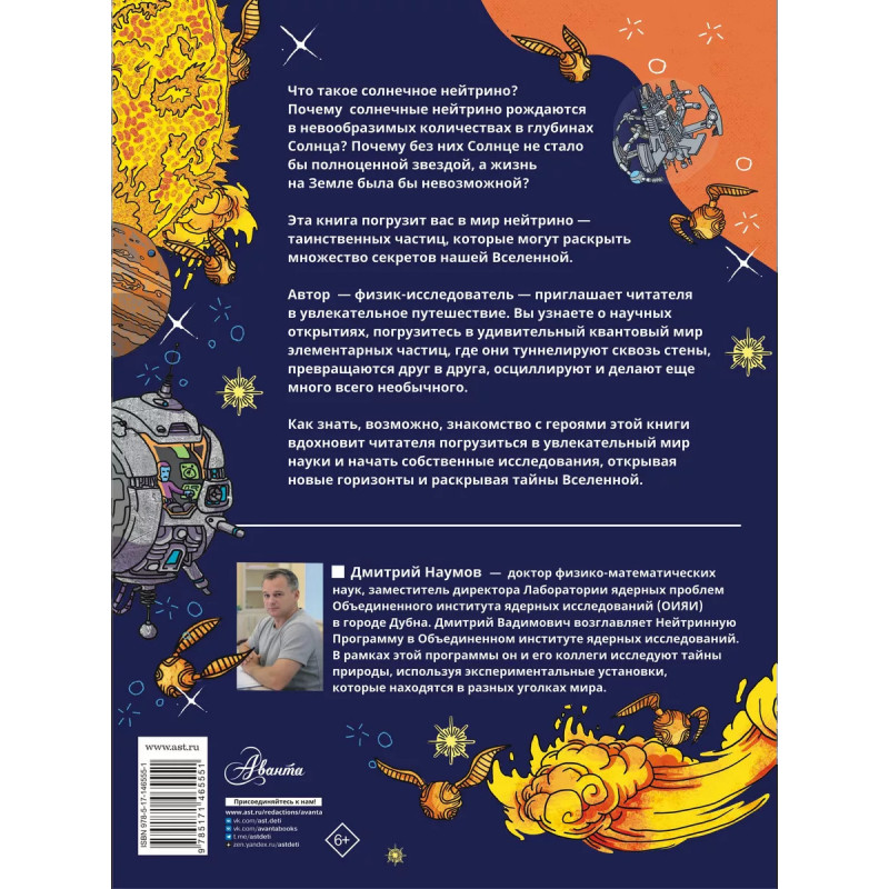 Триллионы мельчайших частиц нейтрино проходят через нас каждую секунду, а мы этого даже не подозреваем! Лучшие российские физики, которые работают Объединённом институте ядерных исследований в Дубне, ловят элементарные частицы, прилетающие на Землю из космоса. Таинственный мир нейтрино может многое рассказать нам о физических процессах, которые происходили в нашей Вселенной задолго до появления людей. Доктор физико-математических наук, заместитель директора по научной работе в Лаборатории ядерных проблем Дмитрий Наумов впервые написал детскую книгу и посвятил её солнечным нейтрино. Учёный предлагает юному читателю погрузится в мир большой науки о маленьких частицах.