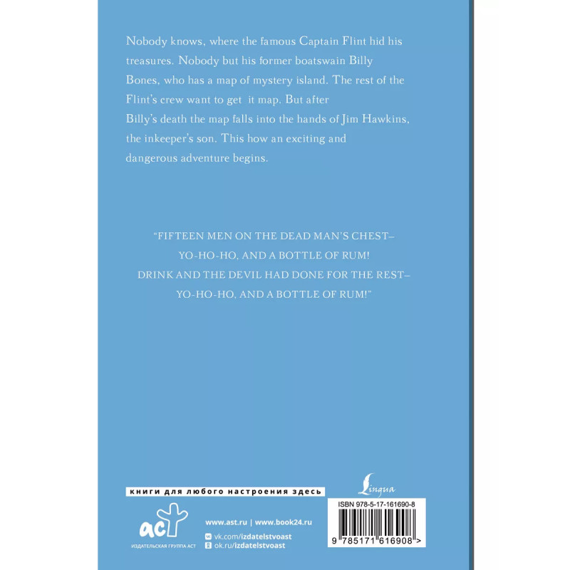 Treasure Island. С детства мечтаете о морских приключениях и поисках пиратского клада? Почему бы не оживить эти мечты с помощью романа Роберта Льюиса Стивенсона "Остров Сокровищ"? Однажды в провинциальной гостинице "Адмирал Бенбоу", стоящей недалеко от Бристоля, появляется необычный постоялец, назвавшийся Капитаном. Он слишком много пьет и явно кого-то боится. Выясняется, что его имя Билли Бонс и он когда-то был членом команды великого Флинта. Бывшие товарищи считают его предателем и вручают черную метку, после чего Билли Бонс умирает от приступа. Сын владельцев гостиницы Джим Хокинс находит в сундуке моряка таинственную карту. Он показывает ее доктору Ливси и сквайру Трелони. Выясняется, что на карте показано, где спрятаны сокровища Флинта. Тогда они решают отправиться на поиски этого клада на судне "Испаньола" под командованием капитана Смоллетта. Героев ждут неожиданные встречи, сражения с пиратами и все опасности моря. Вы можете присоединиться к ним во время чтения, а также насладиться языком автора и деталями истории без