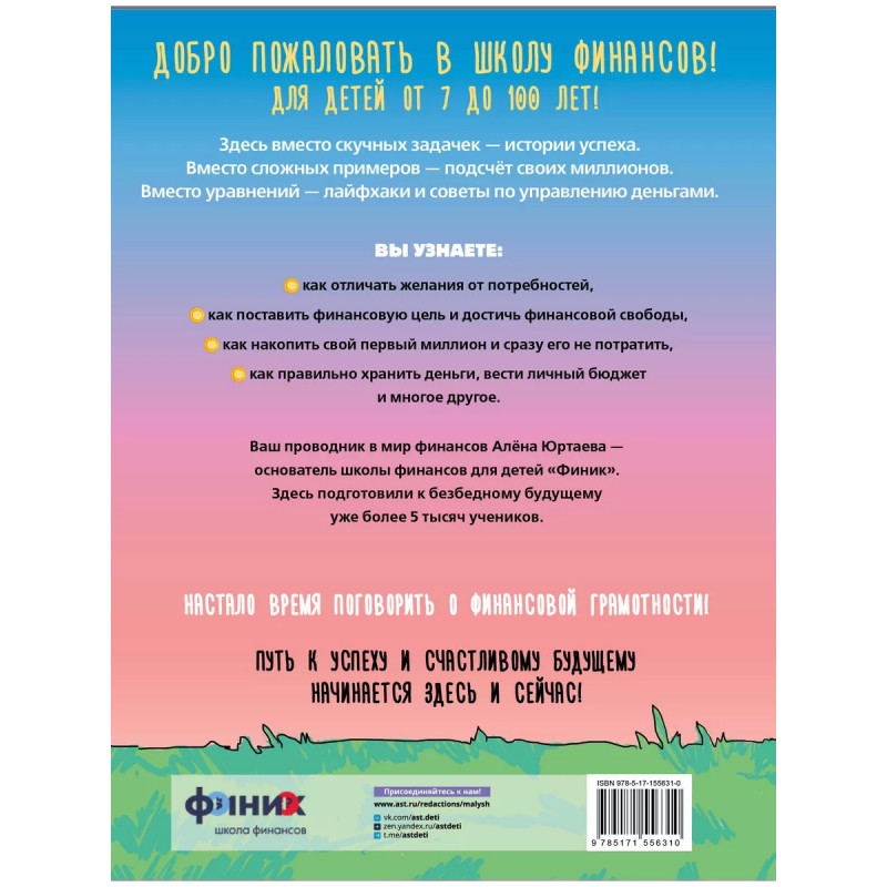 Мечтаешь накопить на новый телефон? Посматриваешь на новые кроссы? Или корзины интернет-магазинов уже показывают шестизначные суммы? Твои мечты могут стать реальностью! Финик это не просто школа. Учителя здесь расскажут, как делать и тратить деньги, ставить цели и добиваться их. Здесь знают, как стать богатым. И этим знанием они решили поделиться в этой книге. Она станет твоим путеводителем в мир финансовой грамотности. Ты узнаешь: - почему выкидываешь деньги в мусорку и даже не замечаешь этого - как покраска волос в синий цвет сделает тебя богаче - как сэкономить на лимонаде и купить часть компании И еще много других лайфхаков и советов от специалистов. Но самое главное узнаешь, как добиться успеха и обрести финансовую свободу.