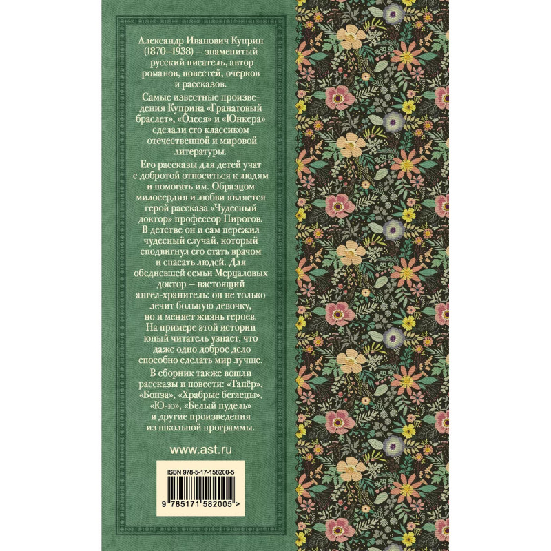 Чудесный доктор. Рассказы. Александр Иванович Куприн (187-1938) - знаменитый русский писатель, автор романов, повестей, очерков и рассказов. Самые известные произведения Куприна "Гранатовый браслет", "Олеся" и "Юнкера" сделали его классиком отечественной и мировой литературы. Его рассказы для детей учат с добротой относиться к людям и помогать им. Образцом милосердия и любви является герой рассказа "Чудесный доктор" профессор Пирогов. В детстве он и сам пережил чудесный случай, который сподвигнул его стать врачом и спасать людей. Для обедневшей семьи Мерцаловых доктор - настоящий ангел-хранитель: он не только лечит больную девочку, но и меняет жизнь героев. На примере этой истории юный читатель узнает, что даже одно доброе дело способно сделать мир лучше. В сборник также вошли рассказы и повести: "Тапёр", "Бонза", "Храбрые беглецы", "Ю-ю", "Белый пудель" и другие произведения из школьной программы.