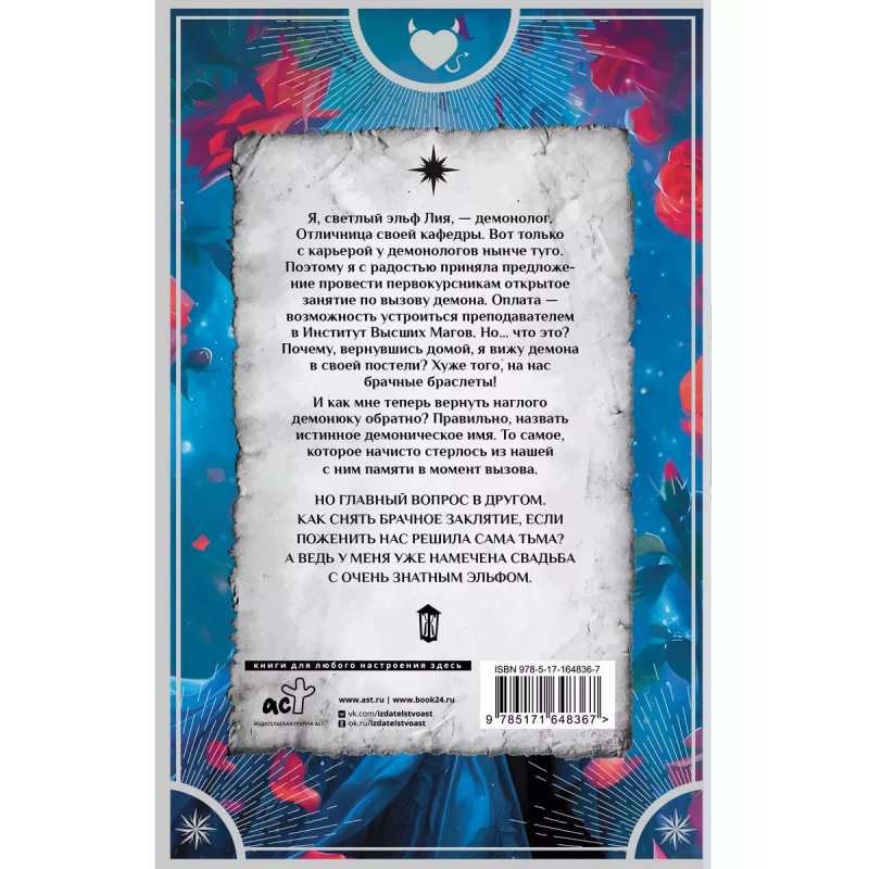 Я, светлый эльф Лия, демонолог. Отличница своей кафедры. Вот только с карьерой у демонологов нынче туго. Поэтому я с радостью приняла предложение провести первокурсникам открытое занятие по вызову демона. Оплата возможность устроиться преподавателем в Институт Высших Магов. Но что это? Почему, вернувшись домой, я вижу демона в своей постели? Хуже того, на нас брачные браслеты! И как мне теперь вернуть наглого демонюку обратно? Правильно, назвать истинное демоническое имя. То самое, которое начисто стерлось из нашей с ним памяти в момент вызова. Но главный вопрос в другом. Как снять брачное заклятие, если поженить нас решила сама тьма? А ведь у меня уже намечена свадьба с очень знатным эльфом.