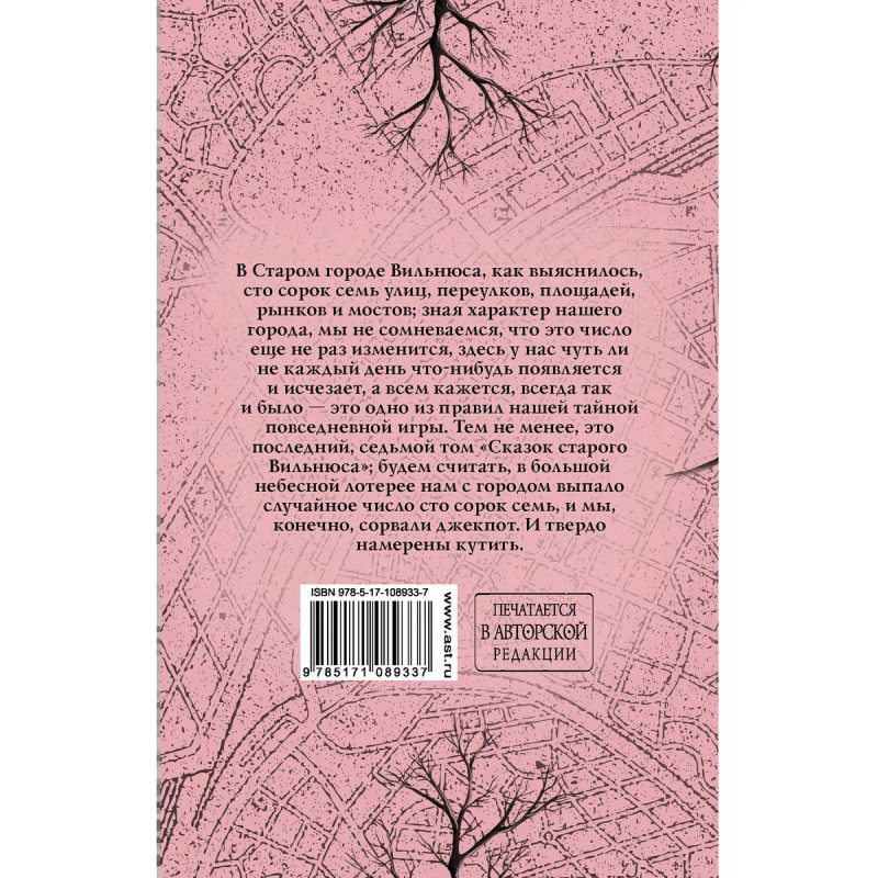 Сказки старого Вильнюса VII. В Старом городе Вильнюса, как выяснилось, сто сорок семь улиц, переулков, площадей, рынков и мостов; зная характер нашего города, мы не сомневаемся, что это число еще не раз изменится, здесь у нас чуть ли не каждый день что-нибудь появляется и исчезает, а всем кажется, всегда так и было - это одно из правил нашей тайной повседневной игры. Тем не менее, это последний, седьмой том "Сказок старого Вильнюса"; будем считать, в большой небесной лотерее нам с городом выпало случайное число сто сорок семь, и мы, конечно, сорвали джекпот. И твердо намерены кутить.