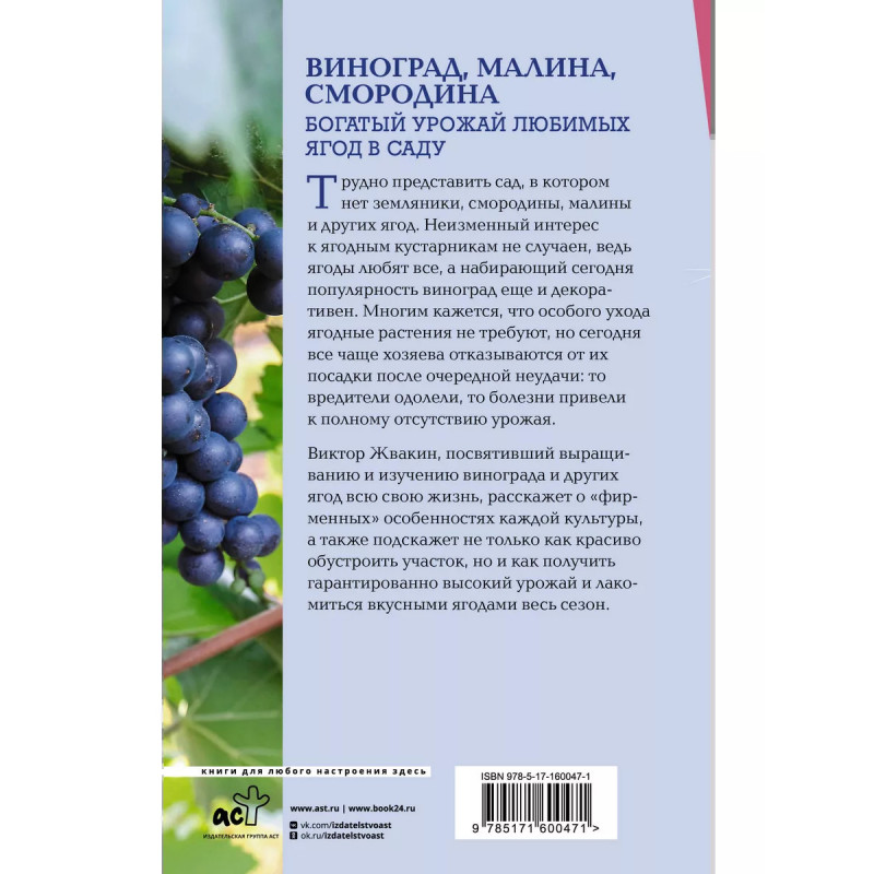 Виноград, малина, смородина. Богатый урожай любимых ягод в саду. Трудно представить сад, в котором нет земляники, смородины, малины и других ягод. Неизменный интерес к ягодным кустарникам не случаен, ведь ягоды любят все, а набирающий сегодня популярность виноград еще и декоративен. Многим кажется, что особого ухода ягодные растения не требуют, но сегодня все чаще хозяева отказываются от их посадки после очередной неудачи: то вредители одолели, то болезни привели к полному отсутствию урожая. Виктор Жвакин, посвятивший выращиванию и изучению винограда и других ягод всю свою жизнь, расскажет о "фирменных" особенностях каждой культуры, а также подскажет не только как красиво обустроить участок, но и как получить гарантированно высокий урожай и лакомиться вкусными ягодами весь сезон.