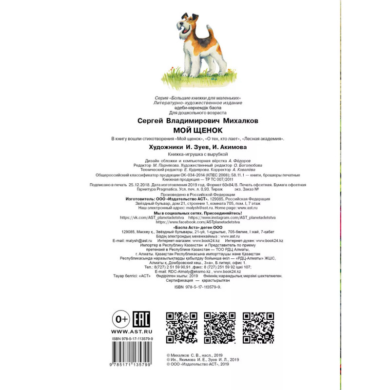 В книгу Сергея Михалкова вошли три замечательных стихотворения - "Мой щенок", "О тех, кто лает" и "Лесная академия". Девочкам и мальчикам обязательно понравятся эти знаменитые произведения и большие красивые картинки к ним!