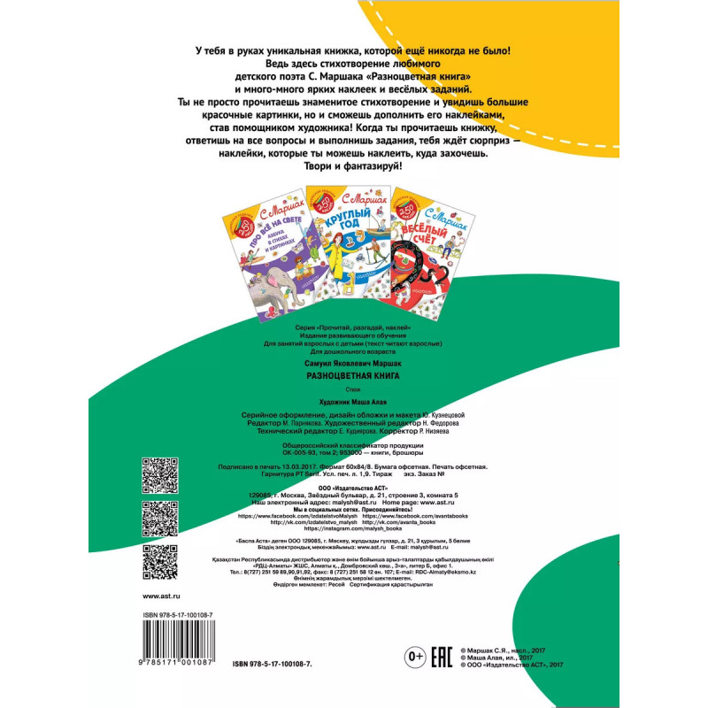 У тебя в руках уникальная книжка, которой ещё никогда не было! Ведь здесь стихи любимого детского поэта С. Маршака и много-много ярких наклеек и весёлых заданий. Ты не просто прочитаешь знаменитые стихотворения и увидишь большие красочные картинки, но и сможешь дополнить их наклейками, став помощником художника!