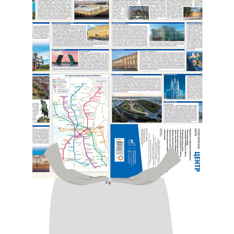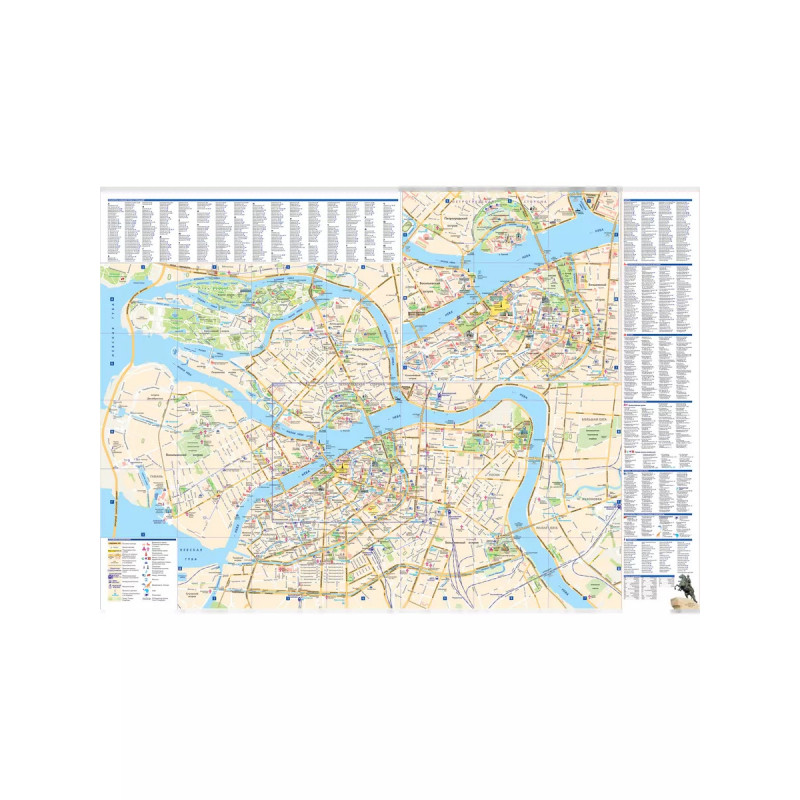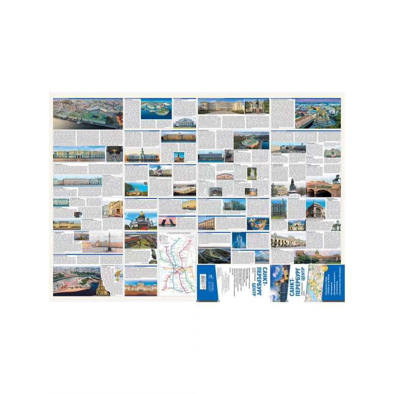 На одной стороне листа - карта Санкт-Петербурга, на другой стороне - краткий путеводитель с описанием основных музеев, театров, выставочных и концертных залов города. На карте наглядно представлена центральная, наиболее интересная в историческом, архитектурном и культурном смысле, часть Санкт-Петербурга. Цветом выделены основные транспортные магистрали города, некоторые интересные туристические объекты, выражаемые в масштабе карты, вокзалы, парки, водные объекты. Театры, музеи и пр. показаны внемасштабными знаками. Некоторые известные здания и сооружения даны рисунками. Карта снабжена подробным указателем улиц и мостов, а также музеев, театров и других учреждений культуры. Основная карта дополнена схемой скоростного транспорта.