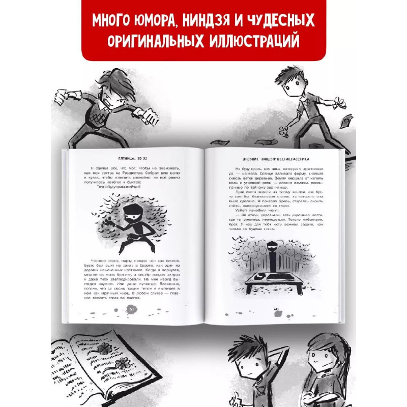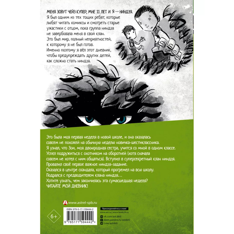 Дневник ниндзя-шестиклассника. Главный герой - шестиклассник Чейз Купер ведёт дневник, в котором рассказывает о своих безумных приключениях. Казалось бы, он обычный школьник, но каждый день с ним происходит что-то сумасшедшее. Всего за одну неделю он успевает подружиться с охотником на оборотней, вступает в суперсекретный клан ниндзя и оказывается в центре скандала, который прогремит на всю школу Хотите узнать, чем закончится эта сумасшедшая неделя? Читайте дневник ниндзя-шестиклассника!