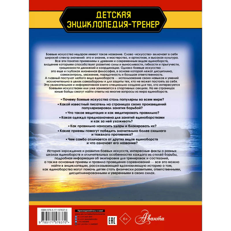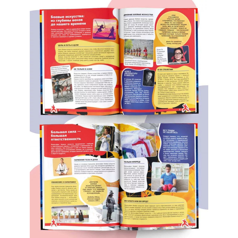 Боевые искусства. Эта книга - не только богатый источник знаний о древних и современных боевых искусствах, но и практическое руко- водство для детей, желающих заниматься единоборствами. Издание рассказывает о самых популярных в мире видах боевых искусств: карате, айкидо, тхэквондо, кунг-фу, джиу-джитсу, дзюдо и самбо. Все стили представлены с подробным описанием истории их зарождения и развития, особый акцент сделан на особенностях, техниках и философских принципах каждого из них. Книга предлагает пошаговые инструкции по выполнению базовых техник, упражнений на гибкость и силу, которые, без сомнения, помогут детям улучшить свои физические данные, отточить координацию движений, стать более крепкими и выносливыми. Кроме того, в ней подчеркивается важность безопасности и этики при занятиях единоборствами, которые воспитывают в юных бойцах дисциплину, самоконтроль и уважение к другим. Для среднего школьного возраста.