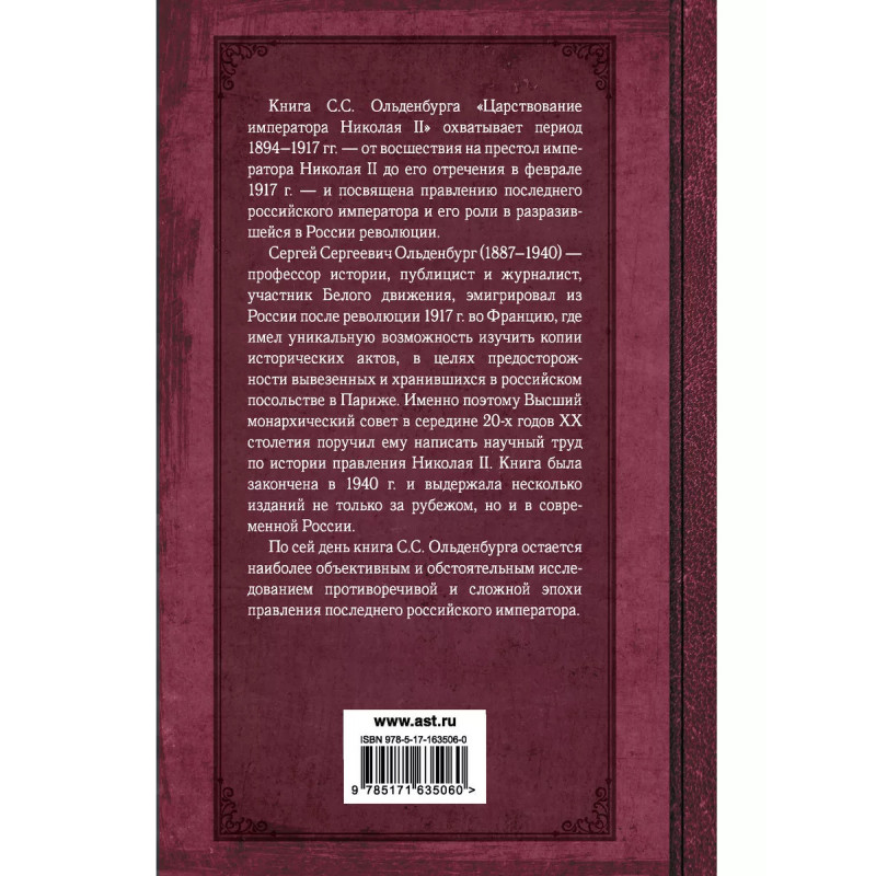 Книга С.С. Ольденбурга "Царствование императора Николая II" охватывает период 18941917 гг. от восшествия на престол императора Николая II до его отречения в феврале 1917 г. и посвящена правлению последнего российского императора и его роли в разразившейся в России революции. Сергей Сергеевич Ольденбург (18871940) профессор истории, публицист и журналист, участник Белого движения, эмигрировал из России после революции 1917 г. во Францию, где имел уникальную возможность изучить копии исторических актов, в целях предосторожности вывезенных и хранившихся в российском посольстве в Париже. Именно поэтому Высший монархический совет в середине 20-х годов XX столетия поручил ему написать научный труд по истории правления Николая II. Книга была закончена в 1940 г. и выдержала несколько изданий не только за рубежом, но и в современной России. По сей день книга С.С. Ольденбурга остается наиболее объективным и обстоятельным исследованием противоречивой и сложной эпохи правления последнего российского императора.