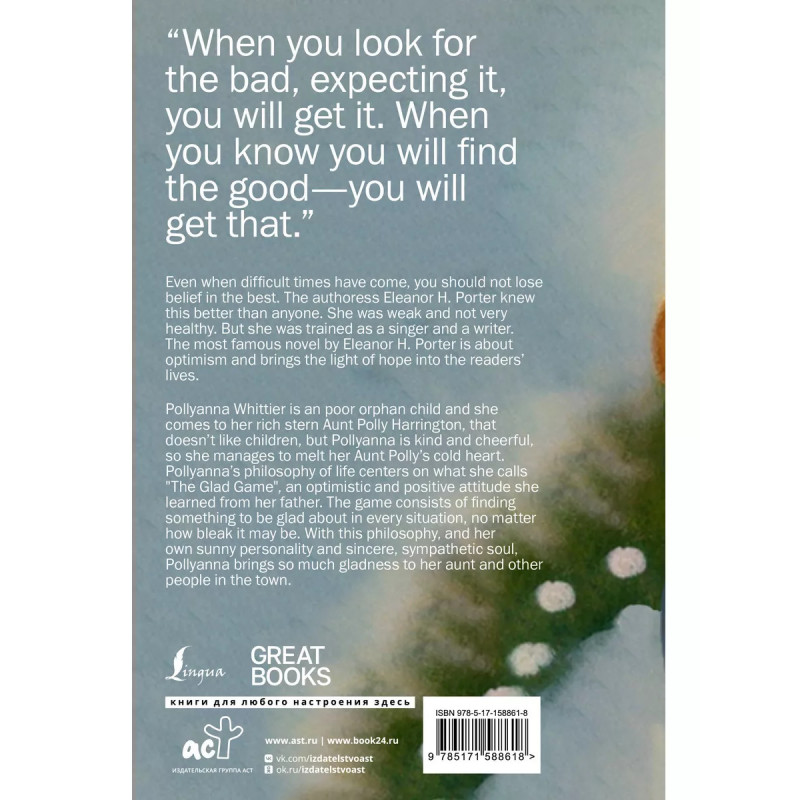 Pollyanna: The First Glad Book. Pollyanna Grows Up: The Second Glad Book. У всех бывают тяжелые времена, но не стоит падать в пучины отчаяния. Берите пример с Поллианны, главной героини одноименного романа Элинор Портер. Основной жизненный принцип Поллианны - во всем находить что-то хорошее. Девочку этой игре "в радость" научил отец-миссионер, а сама Поллианна в свою очередь приобщила к игре всех, кого встречала на своем жизненном пути. Неистребимый оптимизм, доброта и жизнелюбие помогли девочке пережить все невзгоды и вдобавок сделать жизни окружающих счастливее.