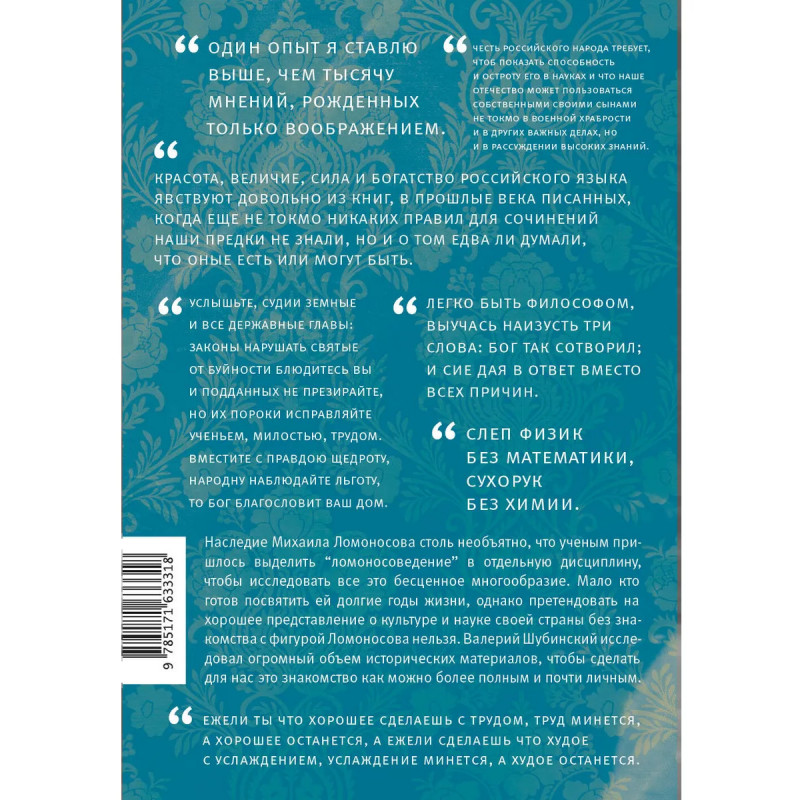 Неизменно стремясь к модернизации своей страны, Михаил Васильевич Ломоносов оказал огромное влияние на самые разные сферы науки и культуры: формирование литературного языка и классического стихосложения, химию, оптику, океанографию, изучение атмосферного электричества, историю, астрономию и не только. Неудивительно, что и личностью он был чрезвычайно разносторонней, неординарной как в хорошем, так и в дурном. Привлекая широчайший круг источников, историк литературы Валерий Шубинский подробно воссоздает как путь Ломоносова-новатора, так и портрет Ломоносова-человека.